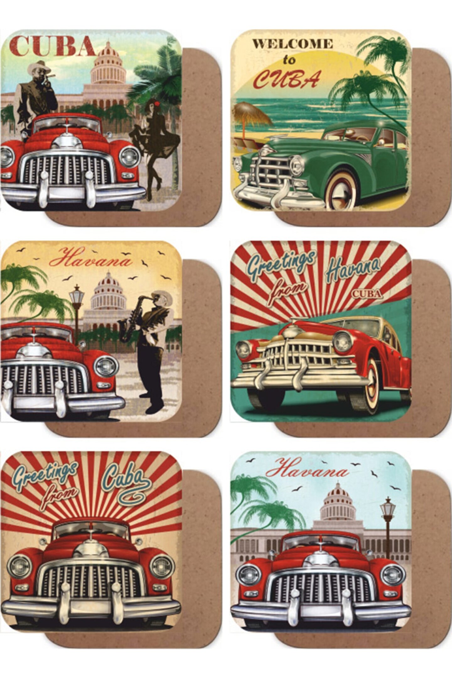 Doğal ahşap malzemesiyle üretilmiş, dayanıklı ve uzun ömürlü kullanım sunar; Küba Havana klasik arabaları temalı tasarımıyla mutfak dekorasyonunuza şık bir dokunuş katar; Altılı set halinde sunulan bu bardak altlıkları, misafirlerinize servis yaparken estetik bir görünüm sağlar; Ahşap yapısı sayesinde her türlü yüzeye kolayca yerleştirilebilir ve kayma yapmaz;