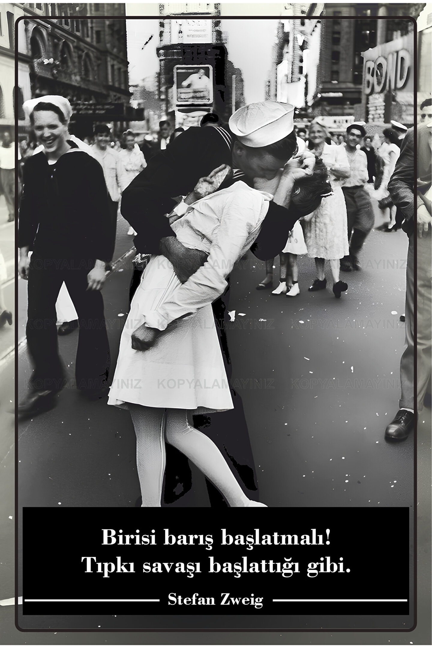 - İkonik Stefan Zweig'in öpüşen asker fotoğrafını içeren bu retro ahşap poster, evinizin dekorasyonuna nostaljik bir dokunuş katıyor.- Çerçevesiz tasarımı sayesinde duvarınızda kolayca asılabilir ve istediğiniz herhangi bir alanda sergilenebilir.- Retro temayı ile zamansız bir estetik sunarak mekanınıza eski günlerden kalma bir hava getiriyor.- Yüksek kaliteli MDF materyali kullanılarak üretilmiş olup uzun ömürlü kullanım vaat ediyor.- Tek parça halinde gelen bu ürün, montaj gerektirmeyen pratikliğiyle dikkat çekiyor.