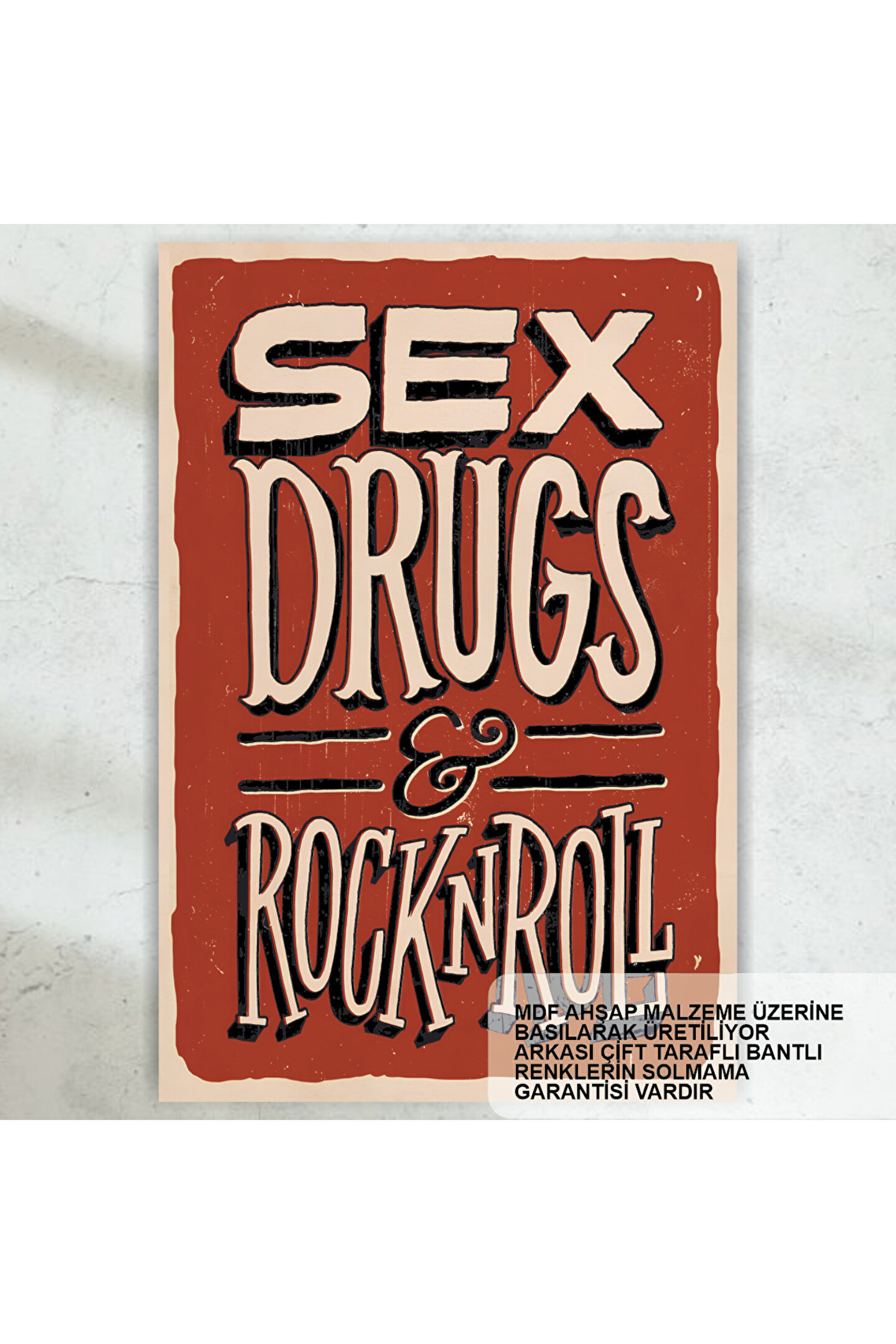 - Retro tasarımıyla dikkat çeken bu müzik ev dekorasyon tablosu, drugs rock n roll temalı posteriyle mekanınıza nostaljik bir hava katıyor.; - Yüksek kaliteli MDF malzemesinden üretilmiş olup, uzun ömürlü kullanım sunar ve dayanıklılığı ile ön plana çıkar.; - Tek parça halinde gelen bu ürün, kolay montaj avantajı sağlayarak zaman kazandırır ve ekstra çerçeve ihtiyacını ortadan kaldırır.; - Çerçevesiz yapısı sayesinde duvarınızda daha az yer kaplar ve istediğiniz şekilde düzenleyebilirsiniz; böylece kişisel zevkinize göre özelleştirme imkanına sahip olursunuz.