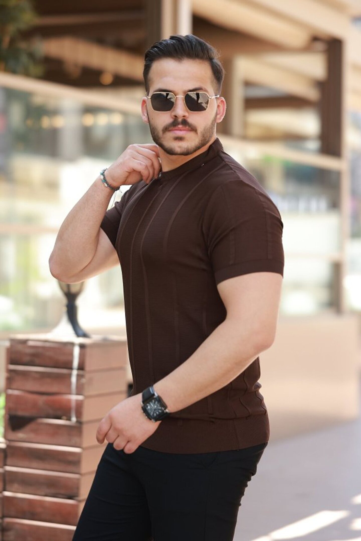 Erkek Desenli çizgi Kabartmalı Kısa Kollu Tişört