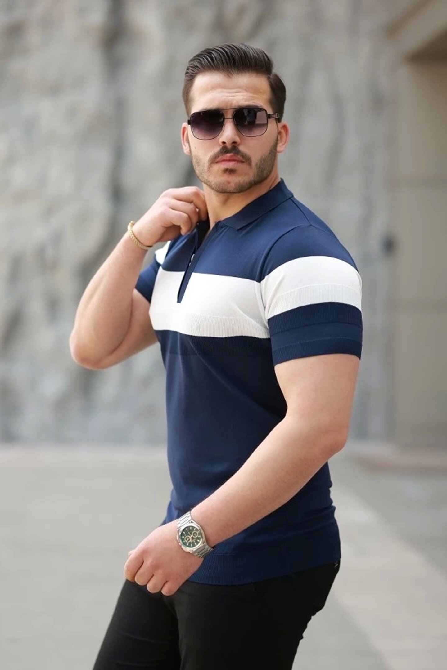 HAZEGO Erkek Fermuar Yakalı şerit Renk Desenli Kısa Kollu Tişört