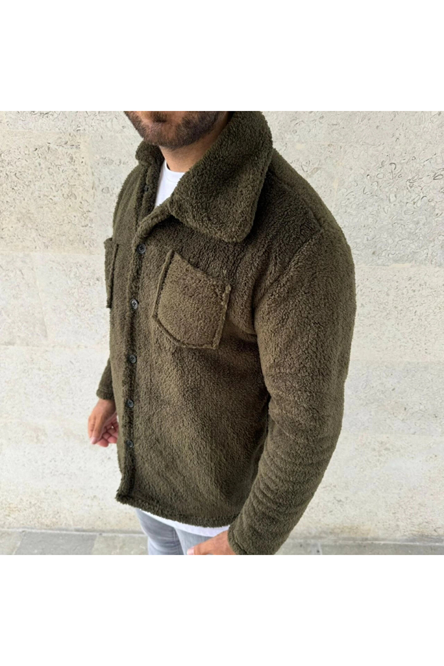 Erkek Pelüş Polar Hırka Gömlek – Yakalı, İlik Düğmeli, Göğüs Cepli, Yumuşak Dokulu Kışlık Regular Fit Rahat Günlük Model - Haki