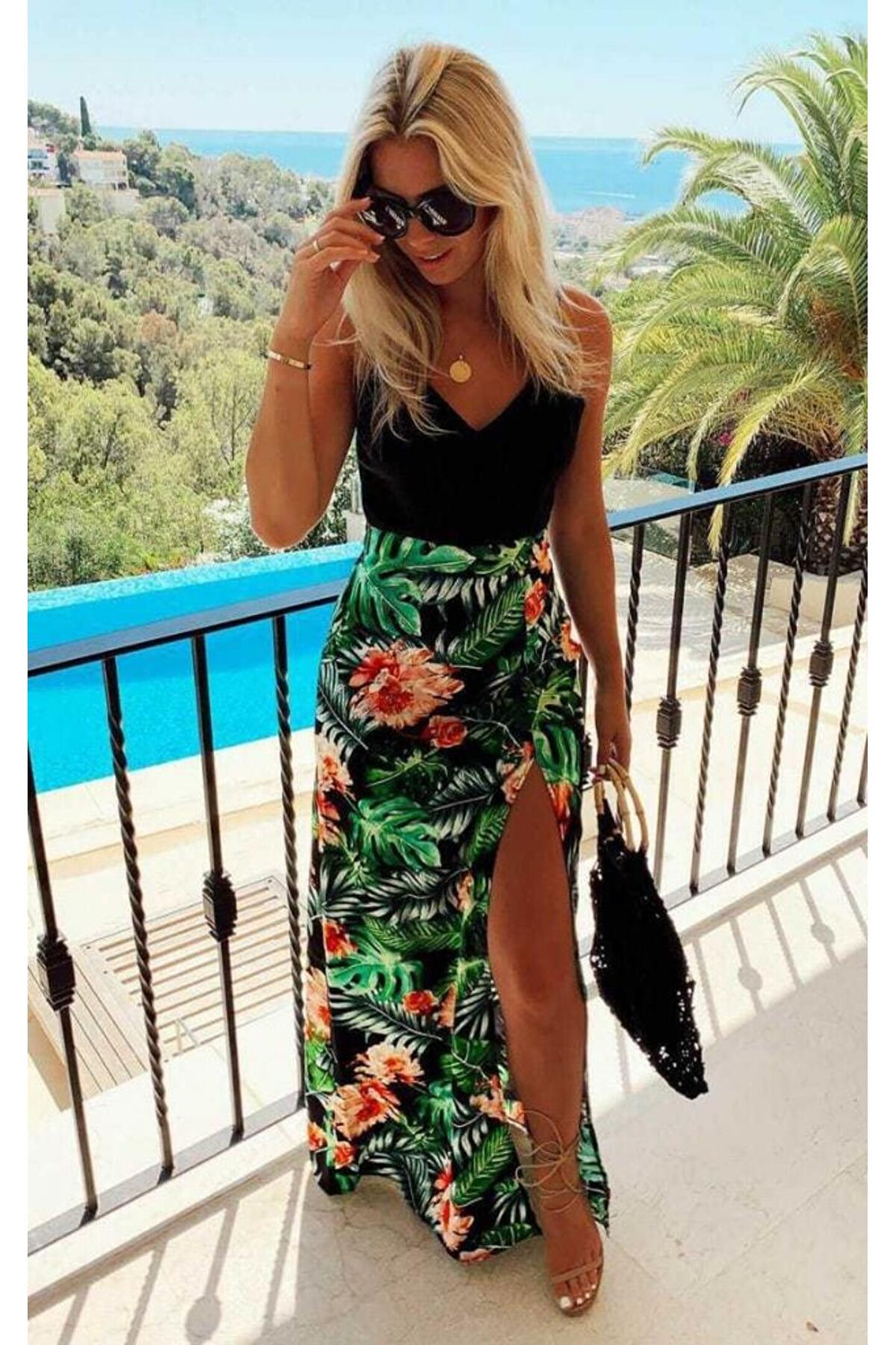 Kadın Askılı V Yaka Eteği Dijital Baskılı çiçek Desenli Yırtmaçlı Mikro Kumaş Elbise