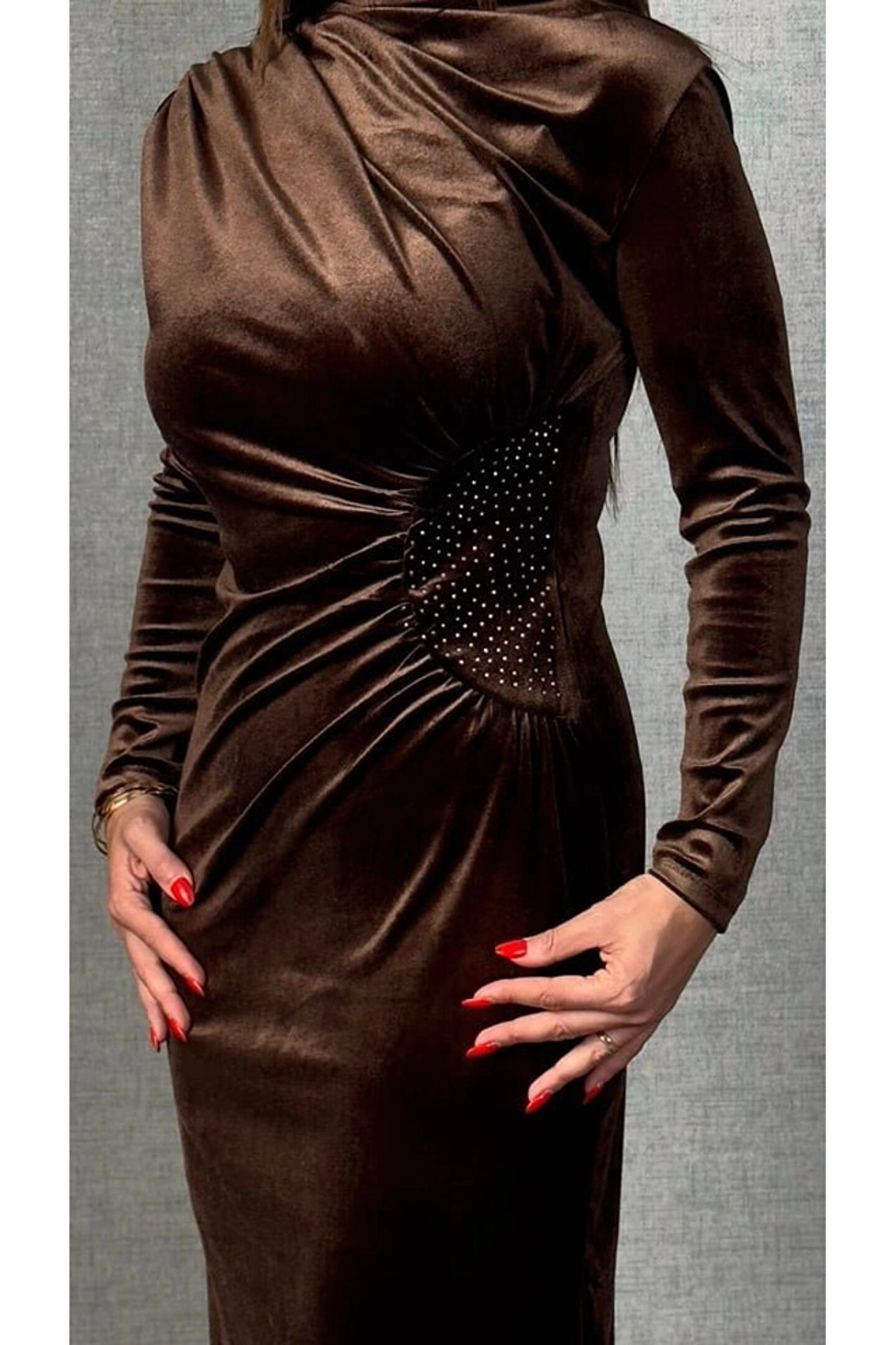 Kadın Balıkçı Yaka Büzgü Ve Taş Işleme Detay Maxi Boy Kadife Elbise