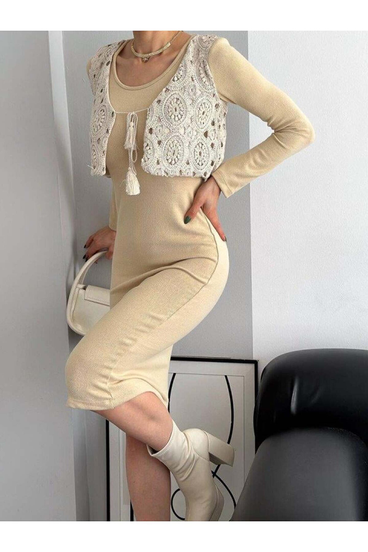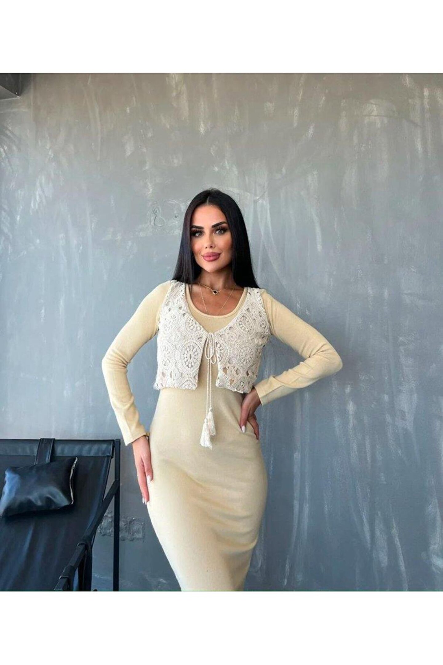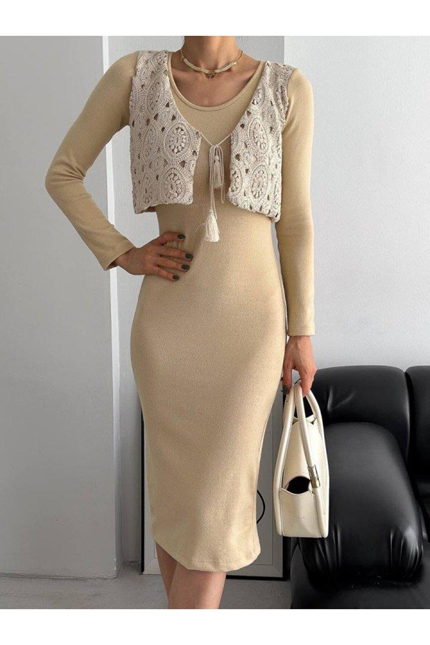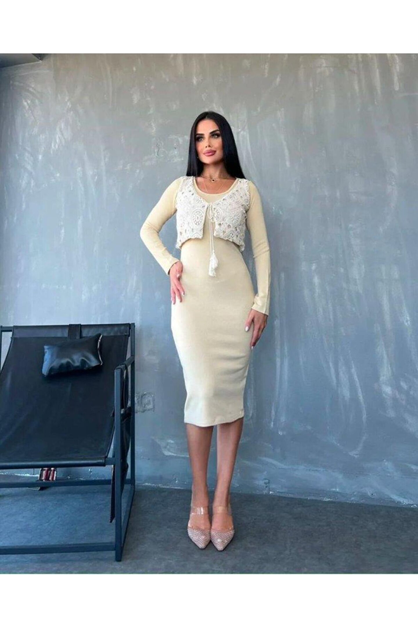 HAZEGO Kadın Bisiklet Yaka Midi Boy Elbise Ve Dantel Güpür Detay Yelek Fırsat ürün Ikili Takım