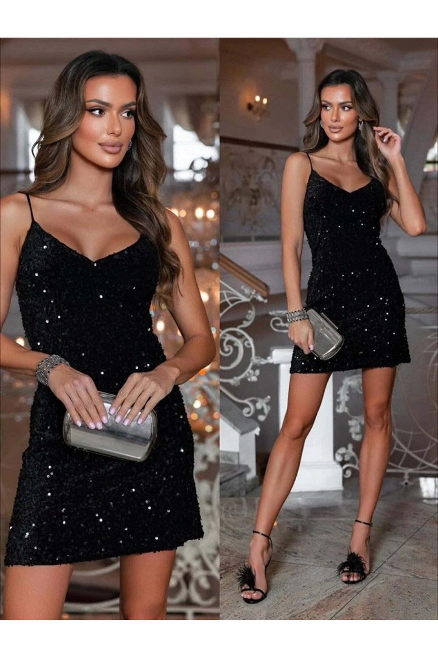 Kadın Omuz Askılı Sırt Dekolteli Kadife Kumaş üzerine Full Pul Payetişlemeli Mini Elbise