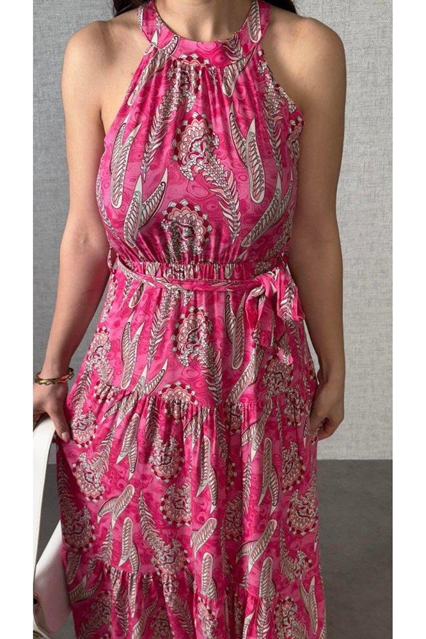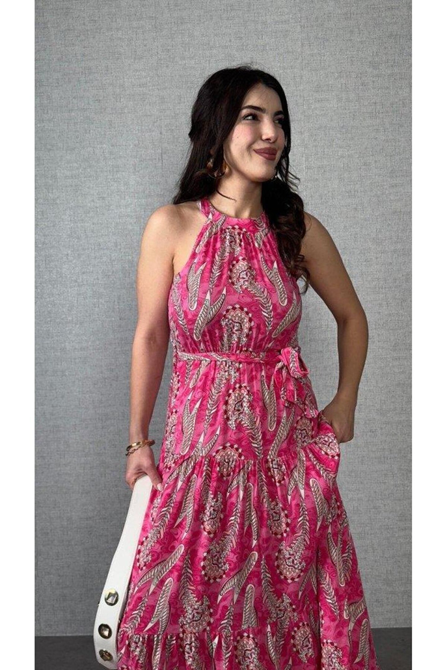 HAZEGO Kadın Omuzlardan Açık Boyundan Geçmeli Desenli Süprem Bluz