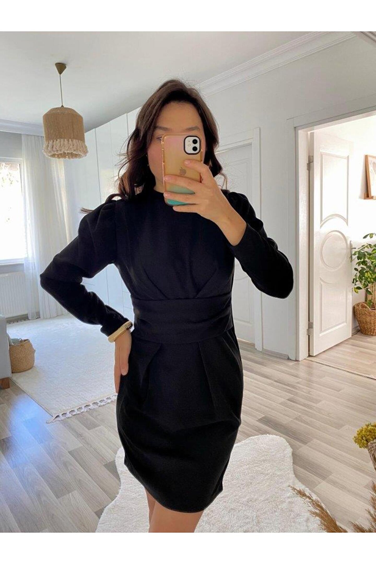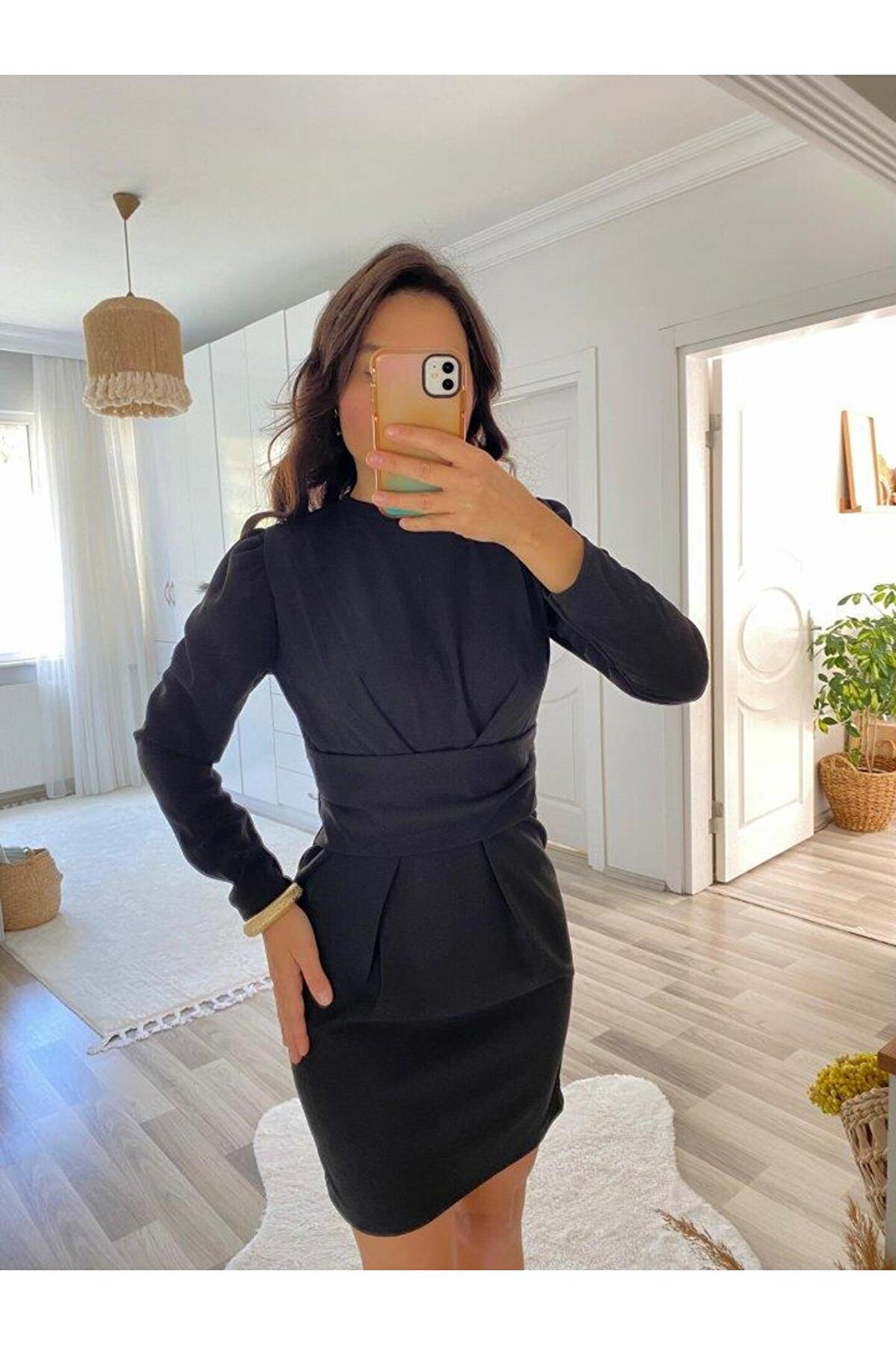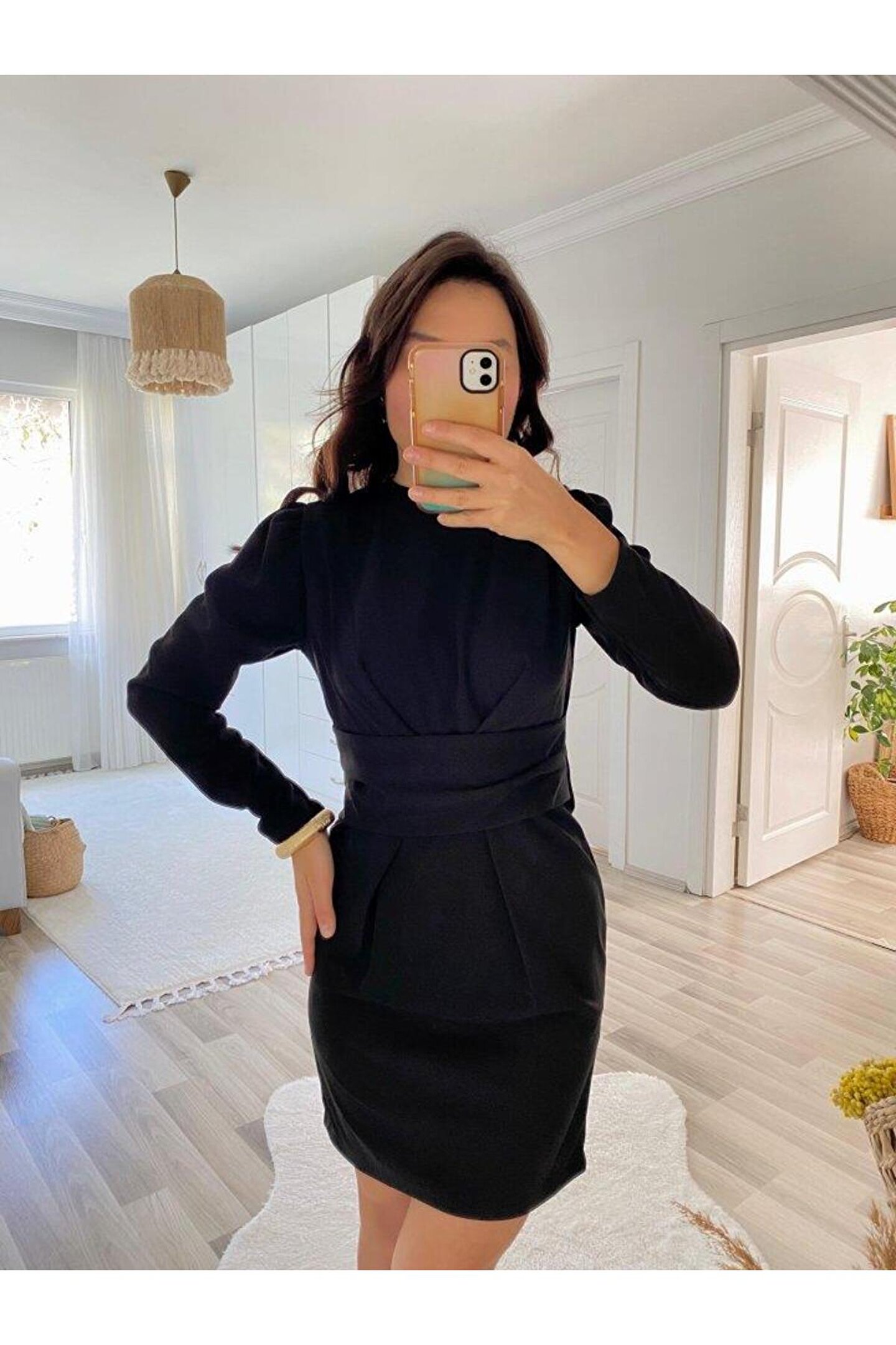 HAZEGO Kadın Uzun Kollu Bisiklet Yaka Bel Kemer Detay Ithal Krep Elbise