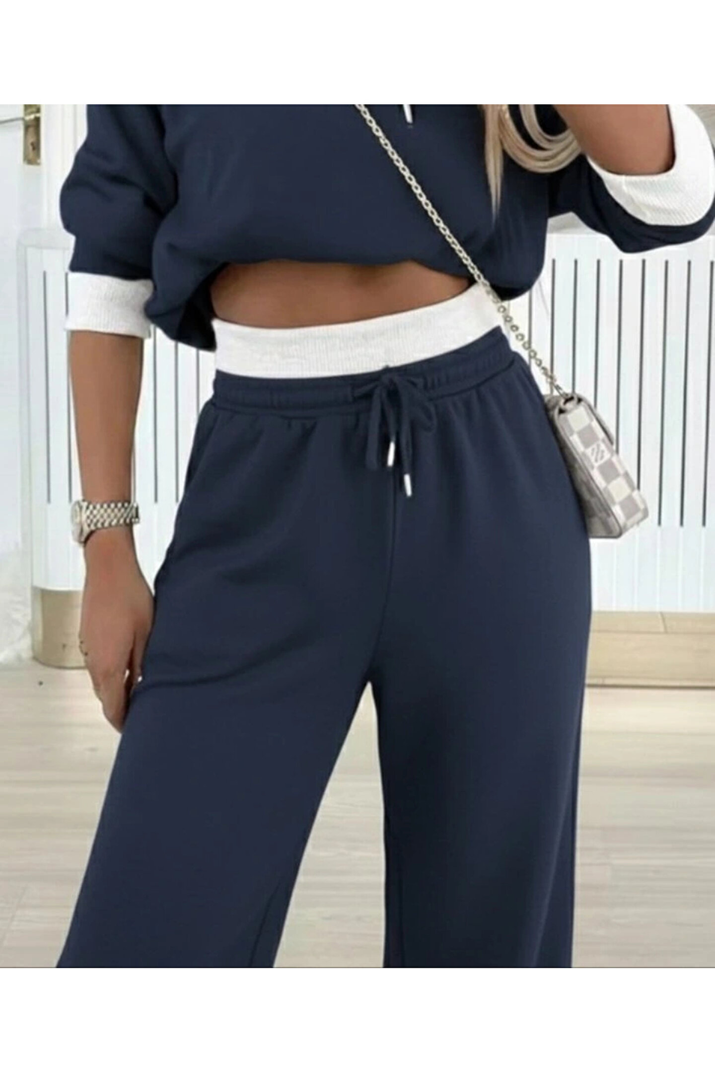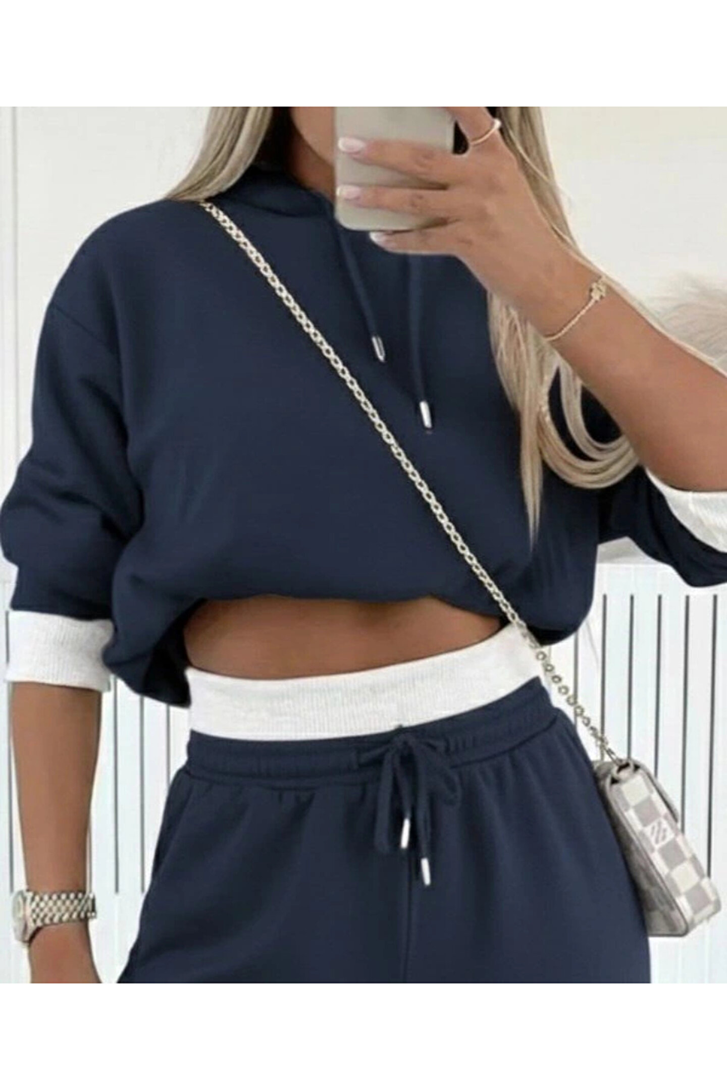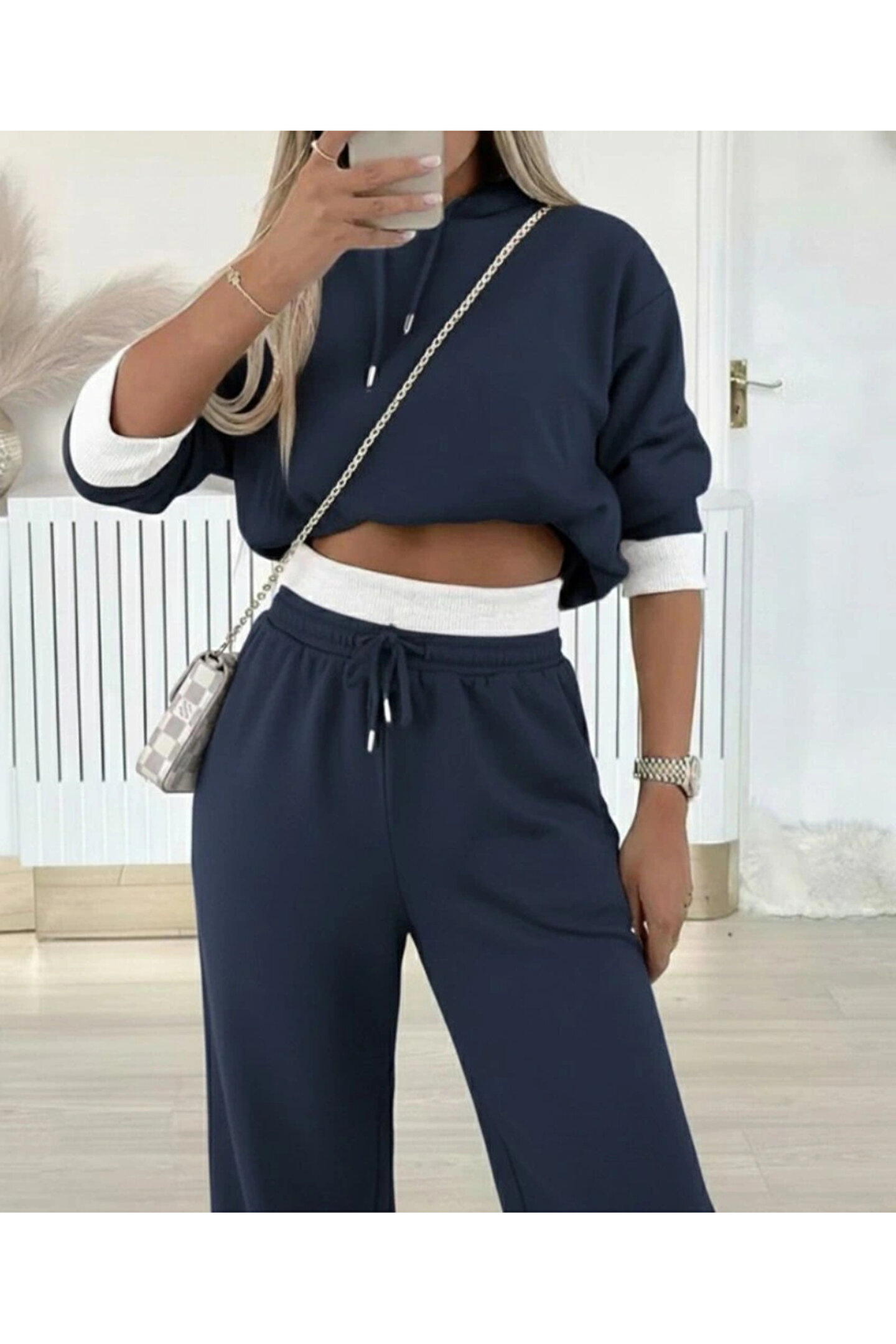Kadın Uzun Kollu Kapşonlu Viskon Iki Iplik Füme Bluz Ve Pantolon Ikili Takım