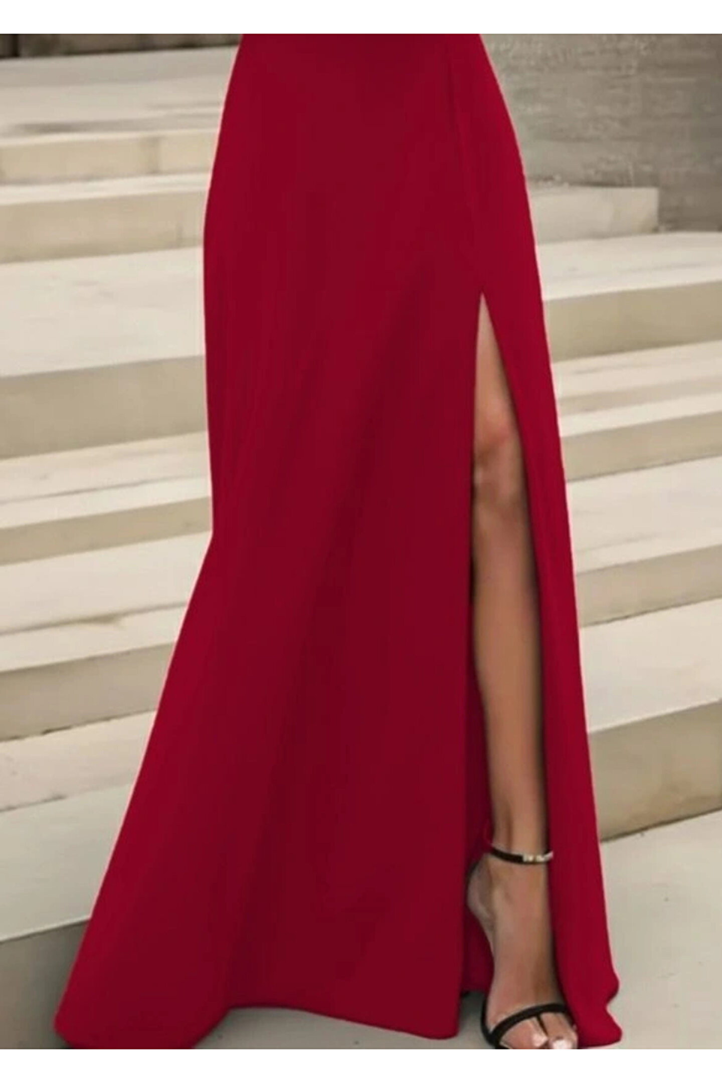 HAZEGO Kadın Uzun Kollu Madonna Yakalı Yırtmaç Detaylı Uzun Ithal Krep Elbise