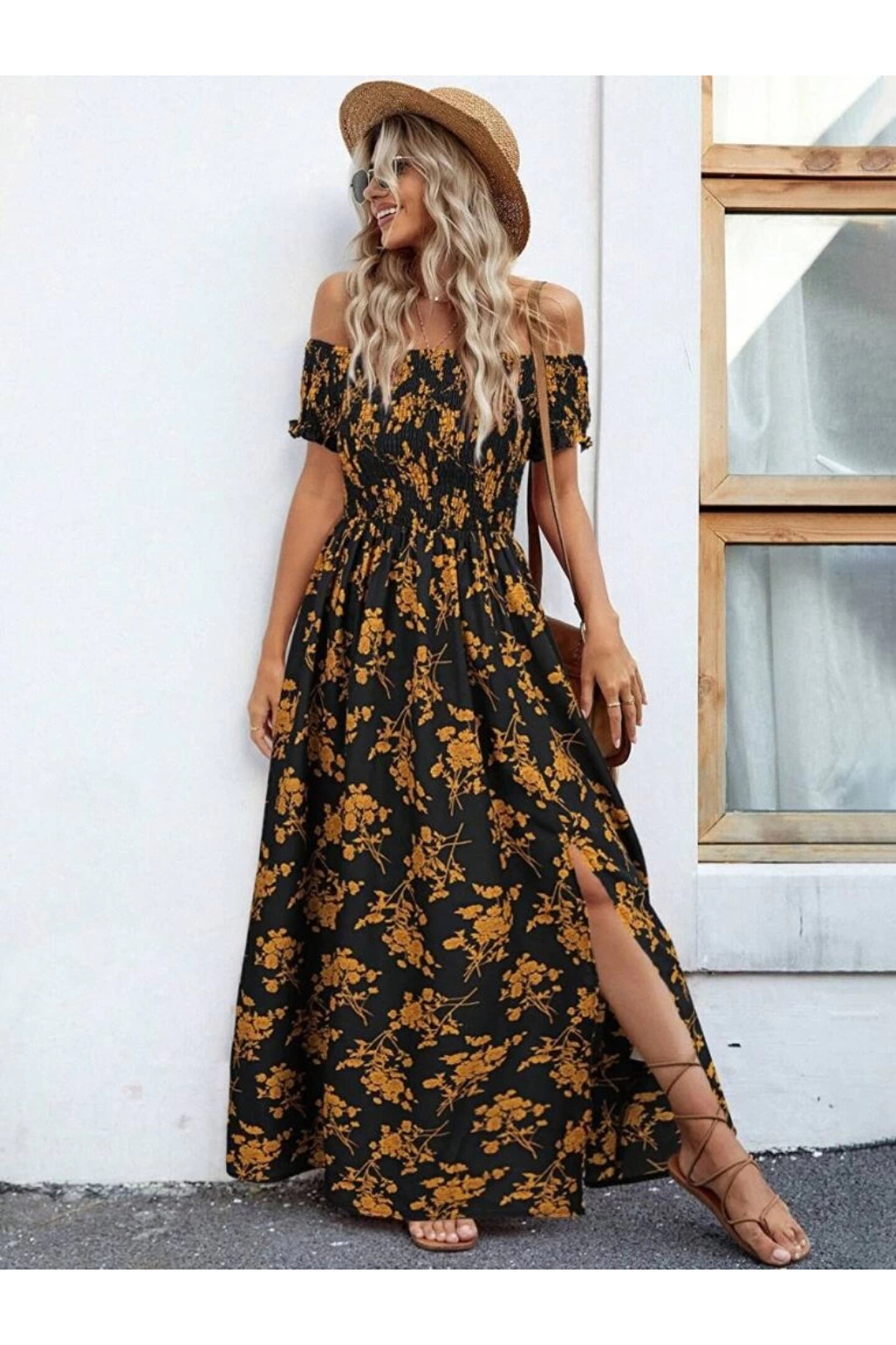 Kadın Kısa Kollu Madonna Yaka Yırtmaçlı çiçek Desenli Süprem Elbise.; Ürün detayları ve kullanım hissi kişisel tercihlere göre değişiklik gösterebilir.
