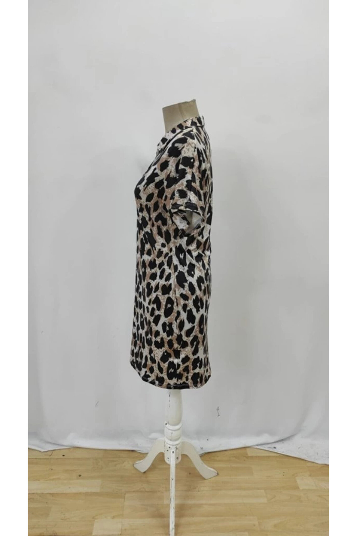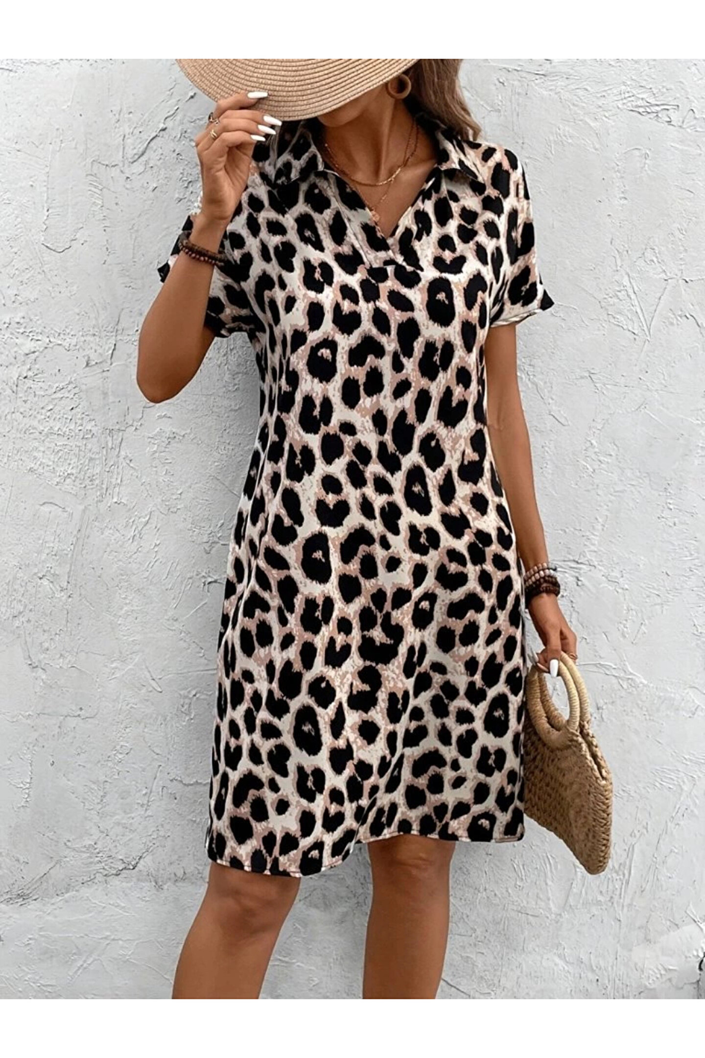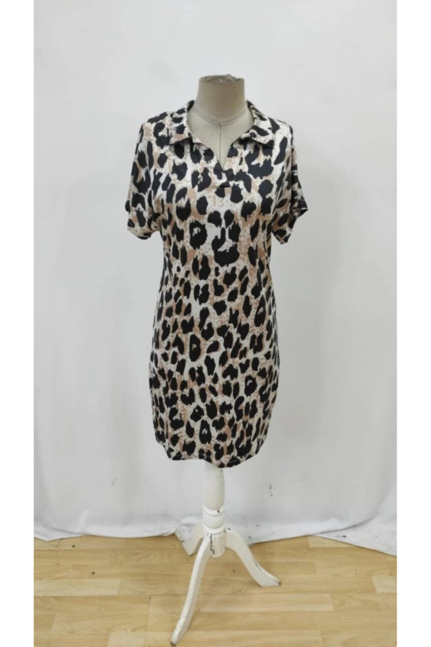Kadın Kısa Kollu Yakalı Leopar Desenli Süprem Elbise