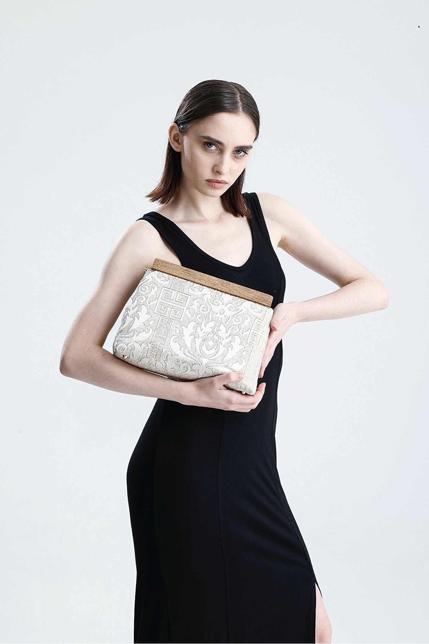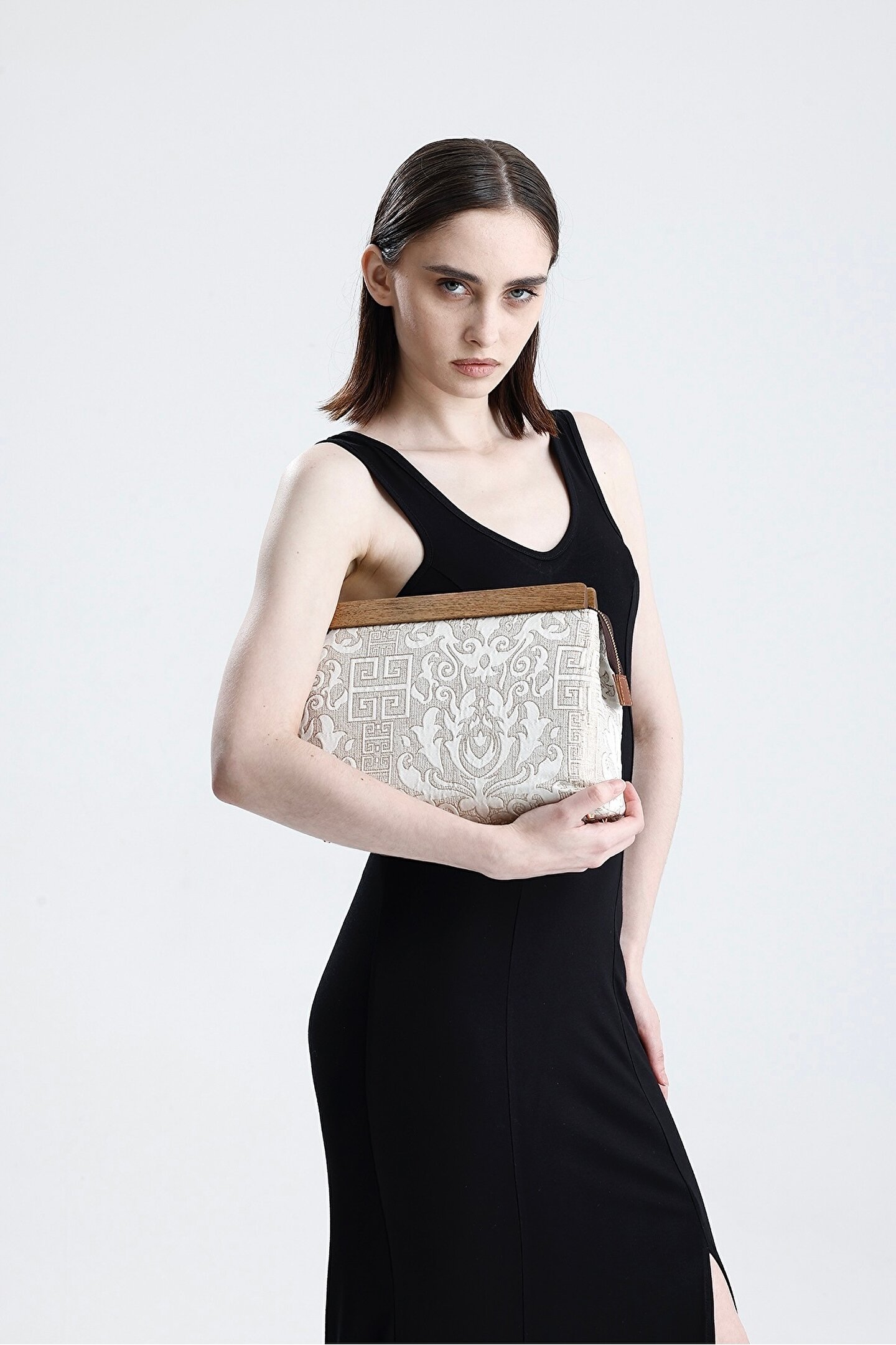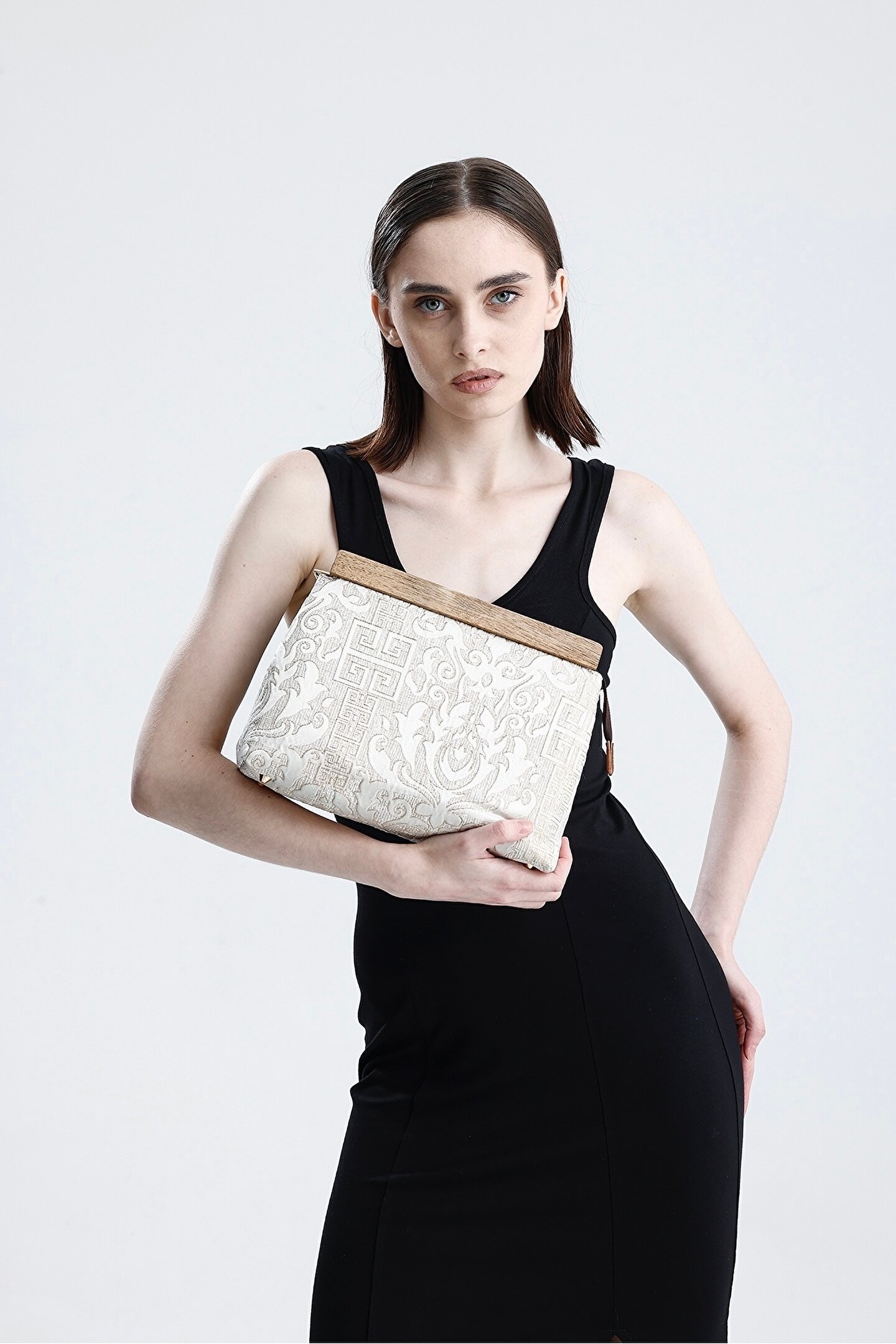 Heybes Kadın Krem Otantik Desen Clutch Çanta; Ceviz ağacının doğal dokusu, etnik desenlerin zarif çizgileriyle buluştu.; Usta işçilikle şekillenen bu parça, doğallığın sıcaklığını ve kültürel esintileri bir arada sunuyor.; Astarlı iç kısmı ve tek iç cebiyle hem şık hem de kullanışlı.; Sade çizgileri, özenli detaylarla birleşerek onu sadece bir eşya olmaktan çıkarıyor, stilinizi tamamlayan özel bir dokunuş haline getiriyor.; Günlük yaşamda farklılık arayan, doğal malzemelerden gelen samimiyeti sevenler için üretildi.; Heybes tarafından özel el işçiliği ile üretilmiştir.; İç kısmı astarlıdır ve 1 adet iç cebi bulunmaktadır.; •Gövde: Dokuma Kumaş •Aksesuar: Doğal Ahşap •İç Materyal: Vegan Deri; 30x21x10 cm (Genişlik x Yükseklik x Derinlik) ölçülerindedir.; • İç hacim yükseklik: 16 cm • İç hacim genişlik: 18 cm