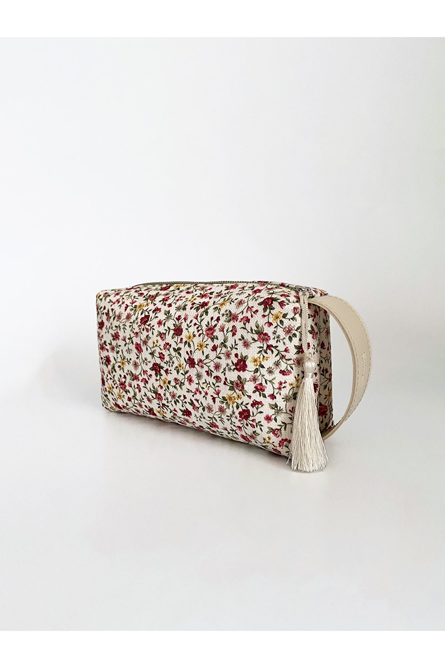 Kadın Çiçek Desenli Kulplu Makyaj ve El Çantası.; Ürünün yanındaki kulp sayesinde elde kolaylıkla taşıma sağlanır.; Renkli ve canlı tonlarıyla enerjik bir görünüm kazandırır, her kıyafetle uyum sağlar.; İç kısmı astarlıdır.; Püskül detayı çıkartılarak da kullanılabilir.; En x Boy x Derinlik: 22x12x8 cm'dir.; Vegan deri ve polyester karışımından üretilmiş olup, hem hayvan dostu hem de dayanıklıdır.; Kurutucu kullanılmaması ve çamaşır suyu/beyazlatıcı gibi kimyasallardan kaçınılması önerilir; böylece çantanızın renkleri ve deseni korunur.