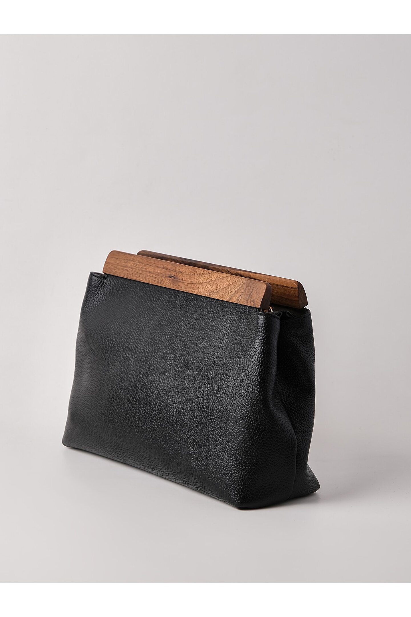Yüksek kaliteli hakiki deri malzemesi, uzun ömürlü kullanım ve şık bir görünüm sunar; Gerçek deri kalitesi, dayanıklılığı artırarak çantanın formunu korumasına yardımcı olur; Siyah renk seçeneği, her türlü kıyafetle kolayca uyum sağlar ve zamansız bir stil oluşturur; Ahşap aksesuar detayları, modern ve sofistike bir dokunuş katarken, el yapımı işçiliği ön plana çıkarır; Clutch çanta tasarımı, küçük eşyalarınızı güvenle taşımanız için idealdir ve günlük kullanım için uygundur;