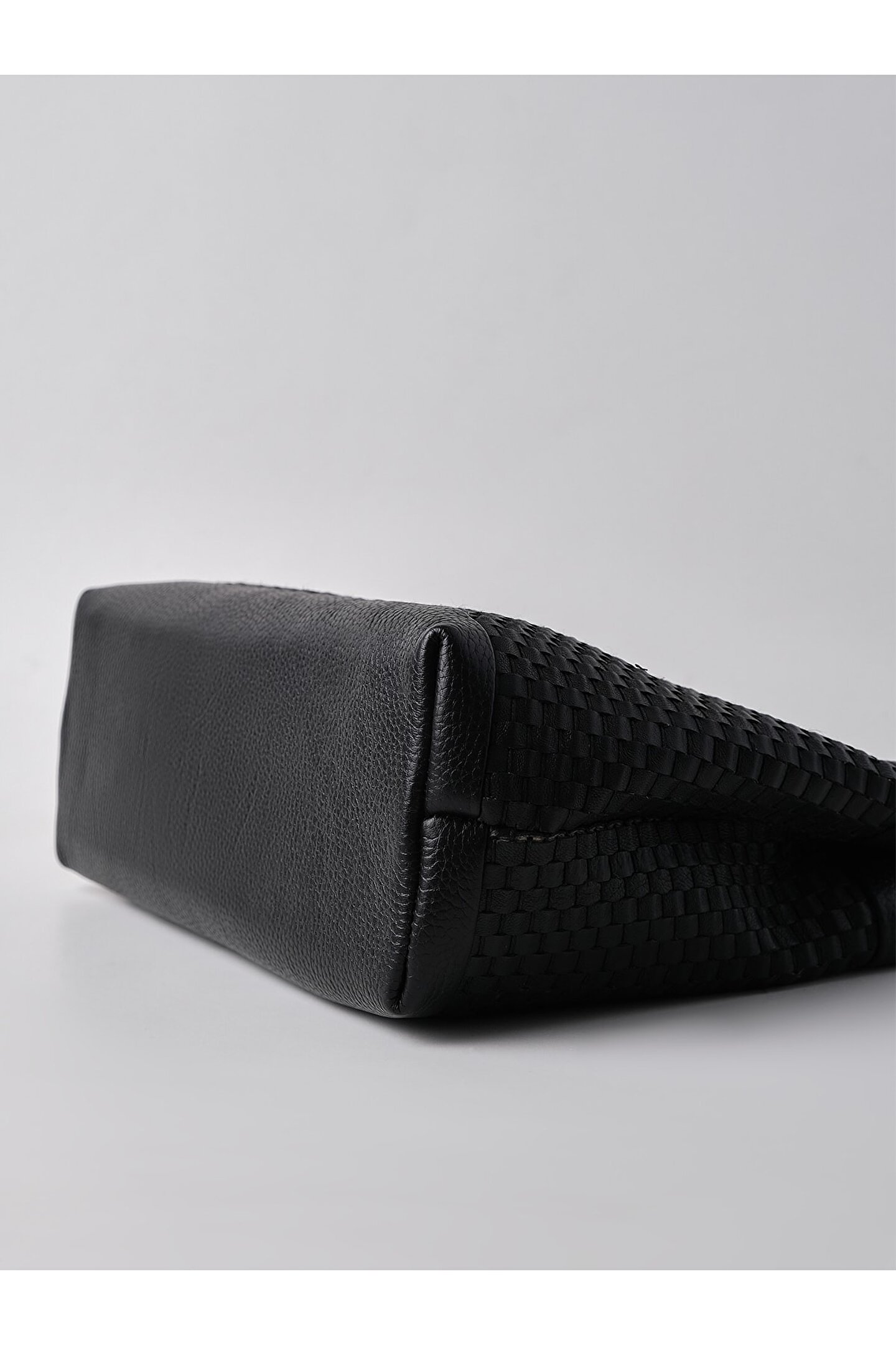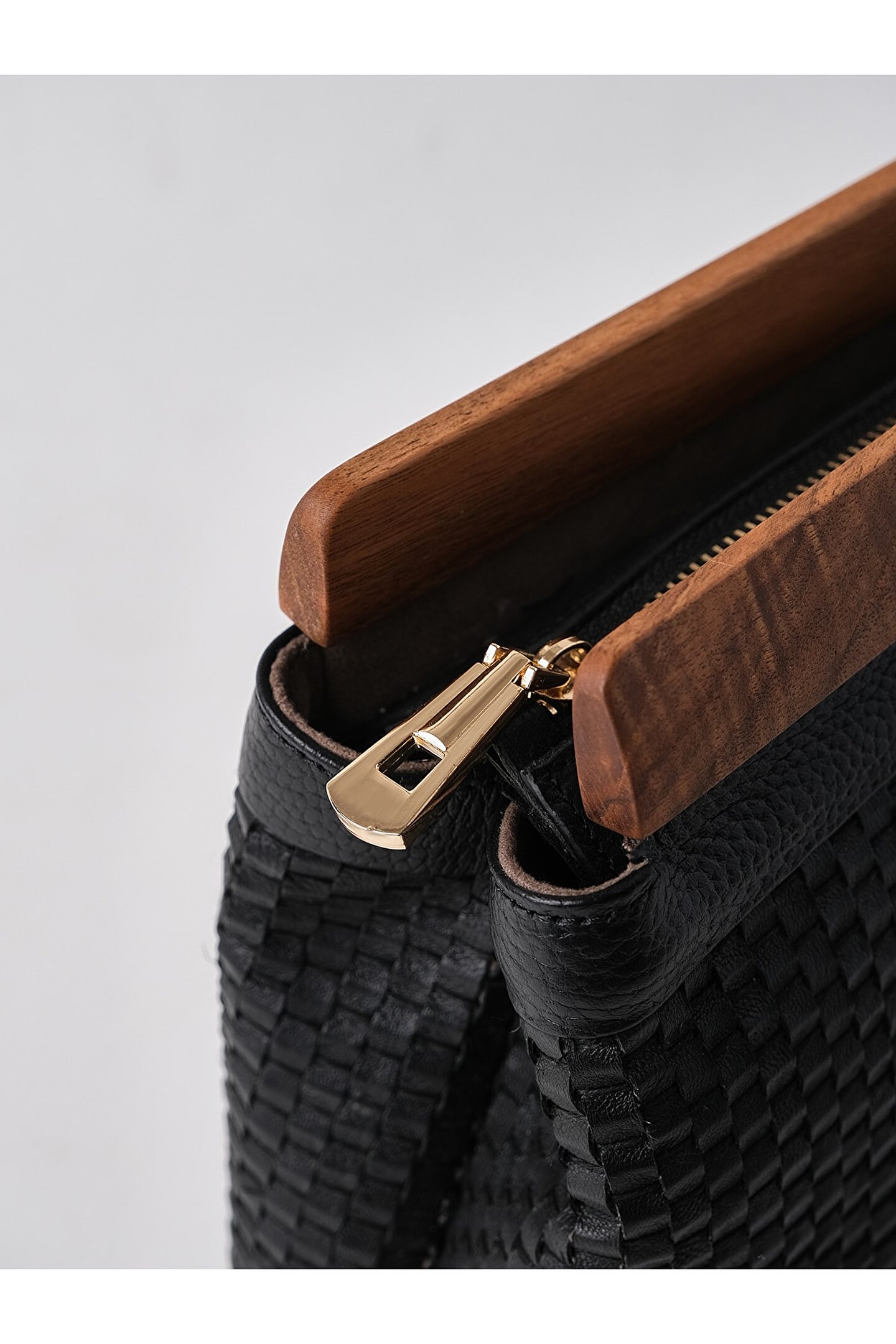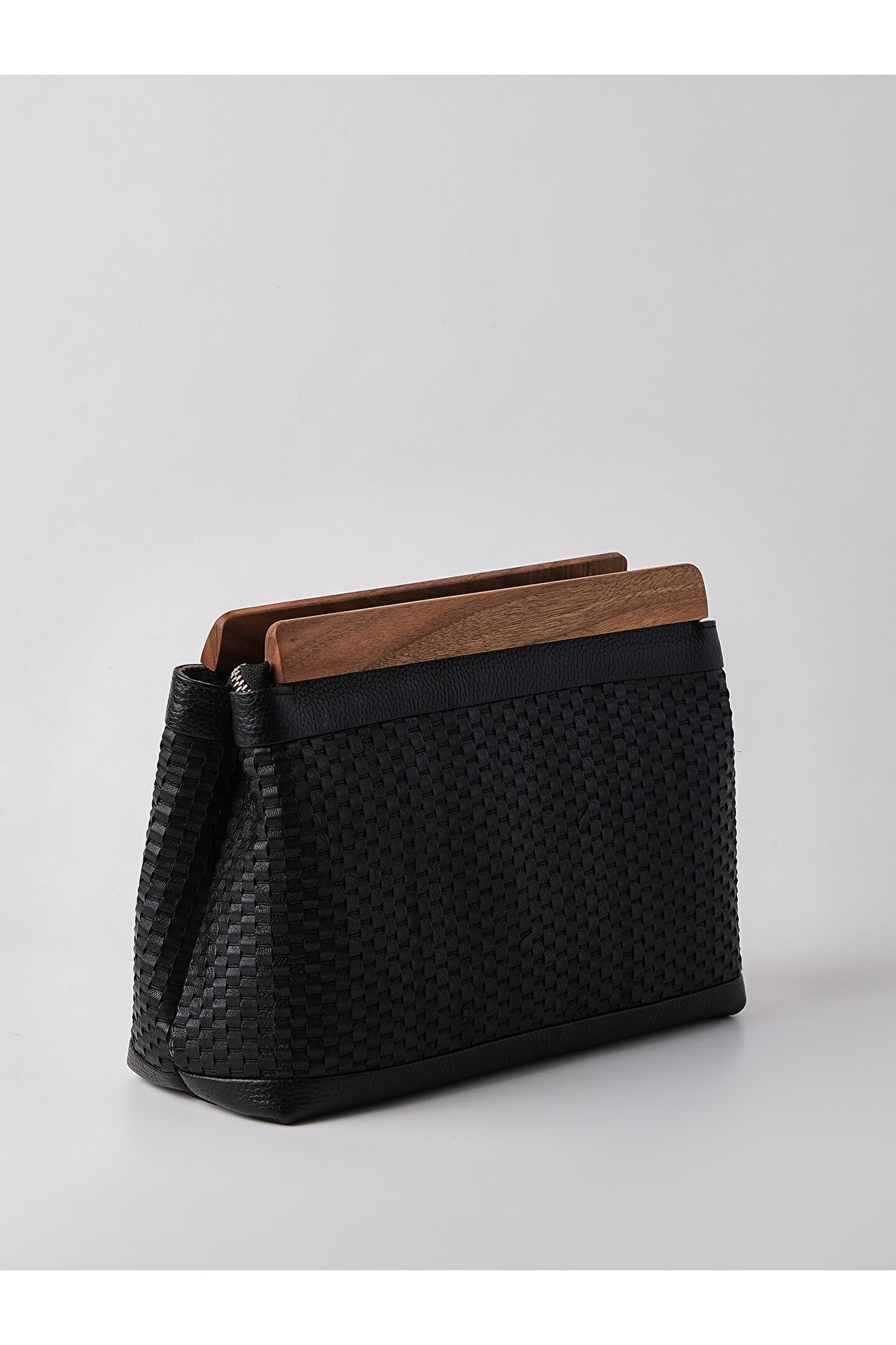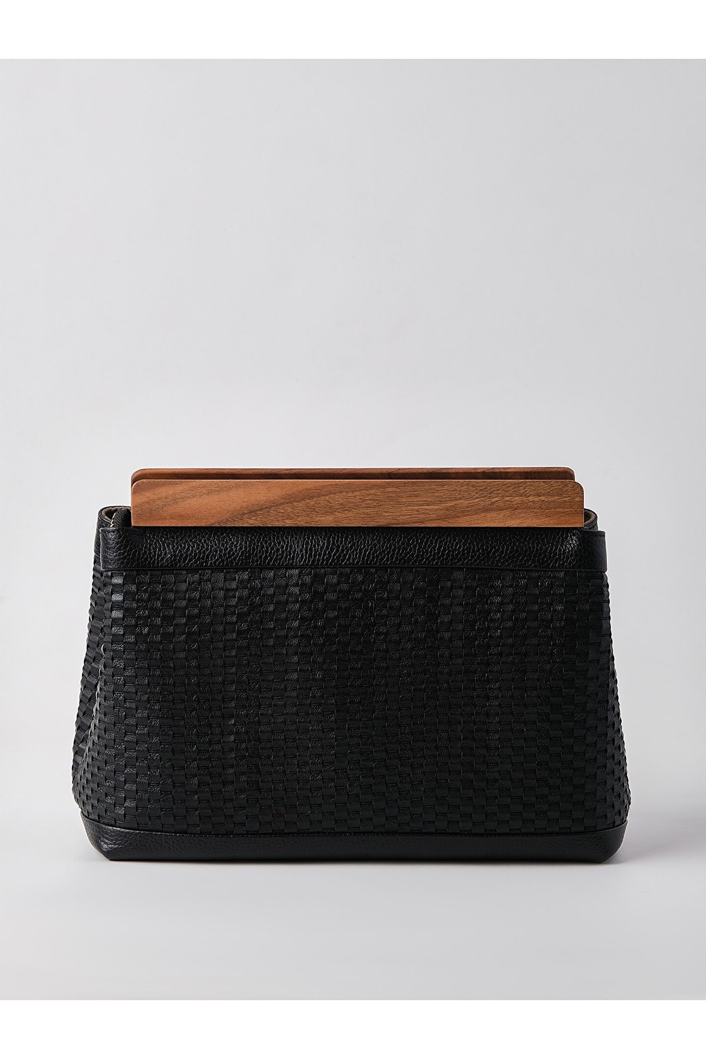 HEYBE‘S Kadın Siyah Hakiki Örme Deri Ahşap Aksesuarlı Clutch El Çantası