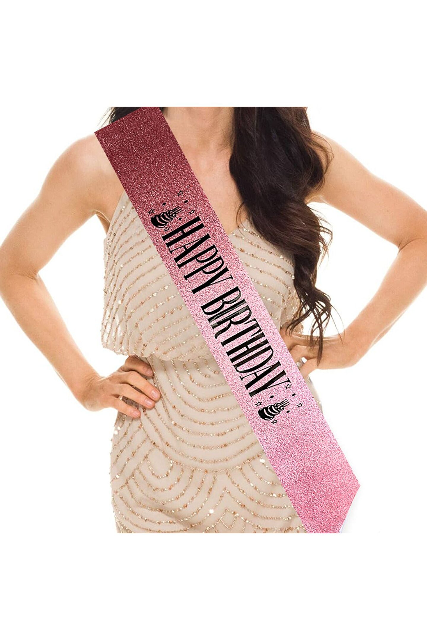 Himarry Pembe Üzeri Siyah Büyük Happy Birthday Yazılı Simli Işıltılı Kuşak Kemer 10 cm Genişlik