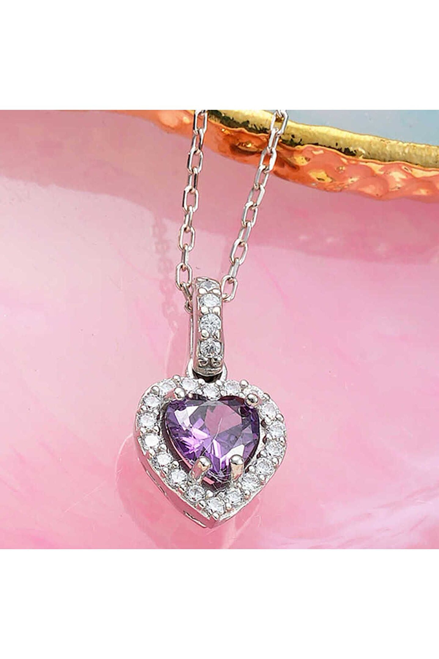 Samur Parti Parti Aksesuar & Kostüm 925 Ayar Gümüş Mor Taşlı Kalpli Kadın Kolye