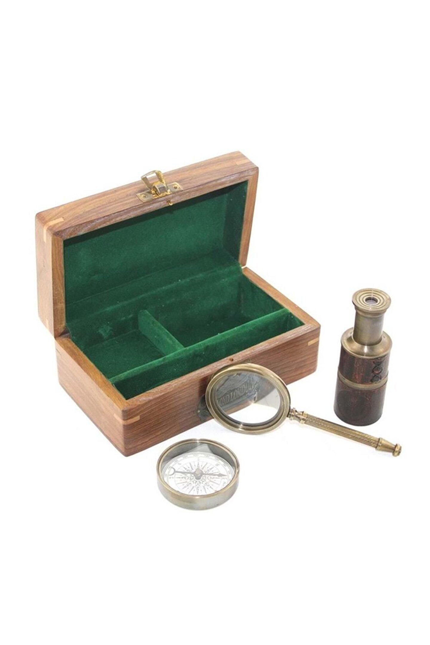 Samur Parti Parti Aksesuar & Kostüm Ahşap Kutu Pirinç Pusula Dürbün Büyüteç Seti