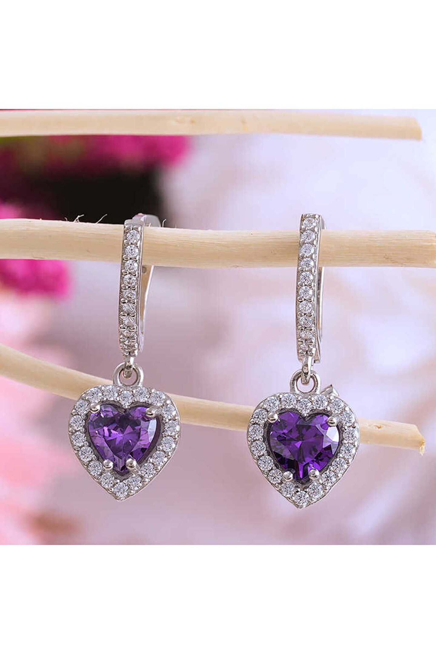 Samur Parti Parti Aksesuar & Kostüm Gümüş Mor Taşlı Kalpli Kadın Küpe