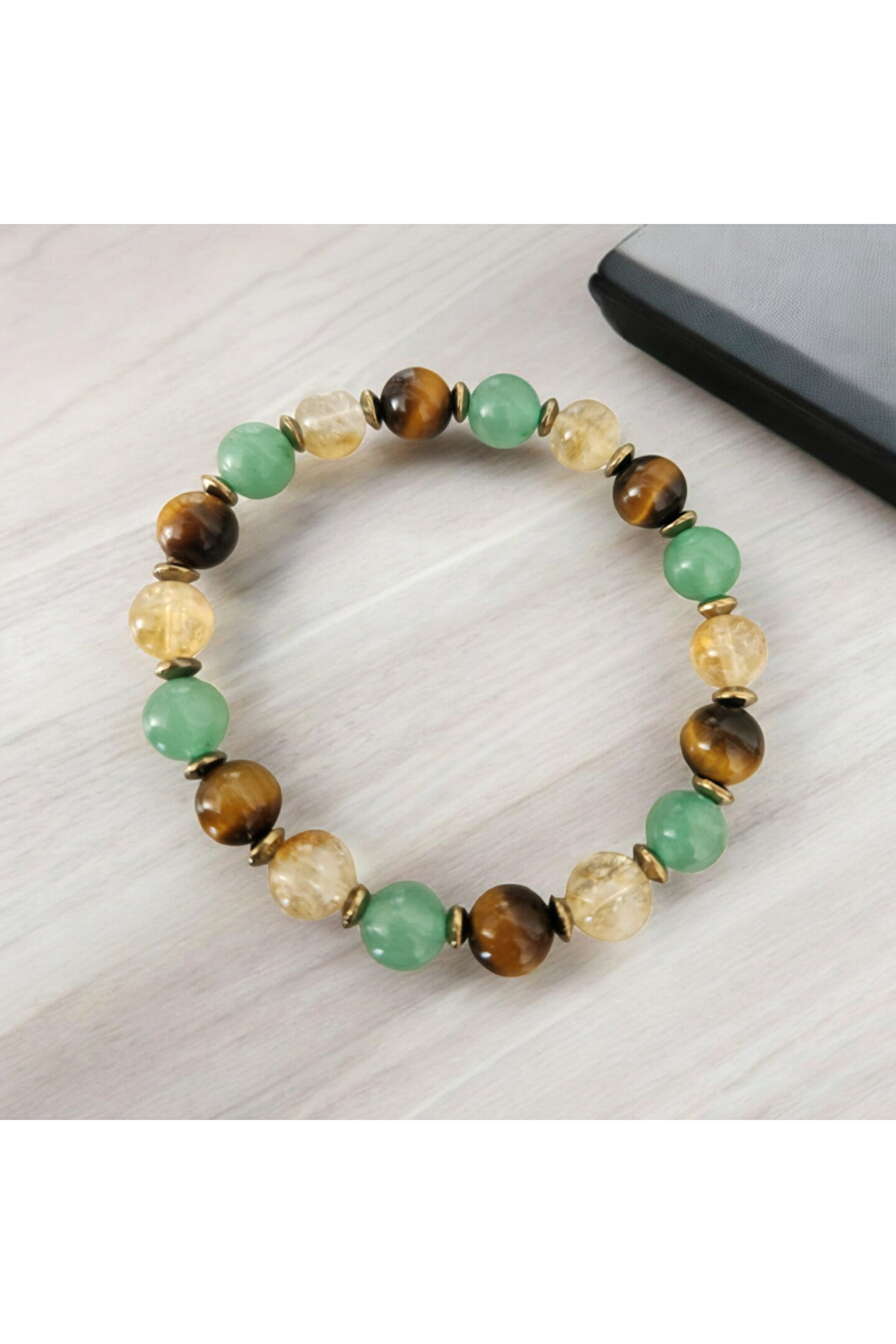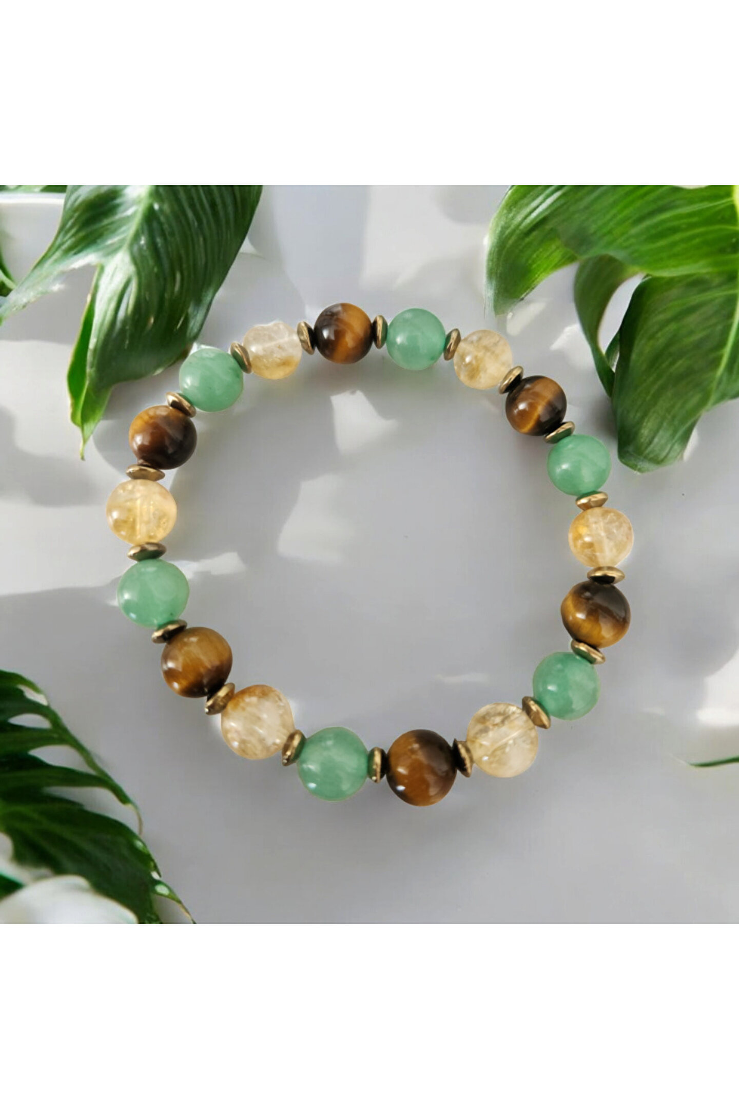 - Doğal taş kullanımı sayesinde, her bileklik benzersiz ve otantik bir görünüm sunar; - Kaplangözü, sitrin ve aventurin gibi değerli taşların birleşimiyle zenginleştirilmiş tasarım, şıklığı ve zarafeti bir arada sunar; - Bolluk, bereket ve şans sembolü olarak bilinen bu bileklik, enerjik ve pozitif bir etki yaratır; - Doğal taş materyalinin sağladığı dayanıklılık ve estetik görünüm, uzun süreli kullanım için idealdir;