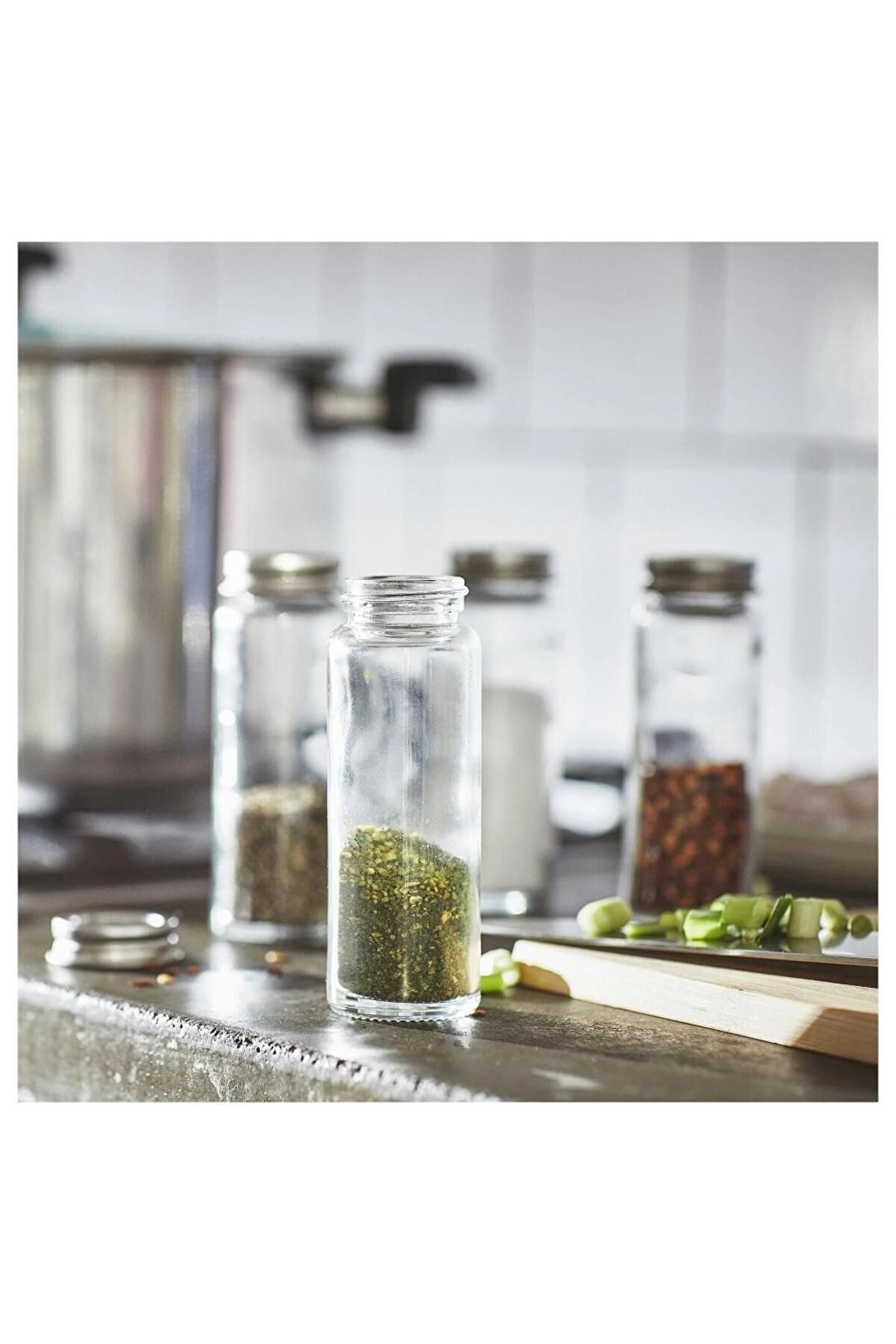 CITRONHAJ baharat kavanozu, cam-paslanmaz çelik, 10 cl, 4 adet CITRONHAJ, baharatlar için çeşitli kaplar içeren bir seridir. ; Sade ve yalın tasarımı sayesinde her mutfak için mükemmeldir ve ihtiyaçlarınızla birlikte büyür. ; Hepsini şimdi satın alın - ya da sadece birkaçını ve zamanla daha fazlasını ekleyin. ; Bu baharat kapları serisi, hepsi basit ve sade bir tasarıma sahip öğütücüler, çalkalayıcılar, kavanozlar ve şişeler içerir. ; Baharat kavanozu UPPDATERA baharat rafı ile birlikte bir çekmecede saklanabilir. ; Ocağın yanında olduğu kadar yemek masasının üzerinde de kullanışlı. ; Ayrıca reçel için veya geziye götürmek için bir meyve suyu şişesi olarak da kullanabilirsiniz. ; Vidalı kapak CITRONHAJ serisindeki diğer küçük kavanozlarda da kullanılabilir. ; Silikon parça, kapağın yerine tam oturmasını ve sabit kalmasını sağlar. ; Baharat kavanozları şeffaf camdan yapıldığı için yeniden doldurma zamanının geldiğini kolayca görebilirsiniz. ; Bilmekte Fayda Var İlk kullanımdan önce ürünü yıkayın. ; Kavanozu sıcak yiyecek veya içecekler için (maks. ; 50°C) kullanmak veya sıcak suyla sterilize etmek istiyorsanız, camın çatlamasını önlemek için kavanozu önce ılık musluk suyuyla önceden ısıtın. ; Bakım Talimatları Bulaşık makinesine girebilir. ; Malzeme Kavanoz:Cam Kapak:Paslanmaz çelik Conta:Silikon kauçuk Ebatlar Paket miktarı: 4 adet Çap: 4 cm Yükseklik: 12 cm Hacim: 10 cl Paket Ölçüleri Genişlik: 13 cm Yükseklik: 5 cm Uzunluk: 20 cm Ağırlık: 0.53 kg;
