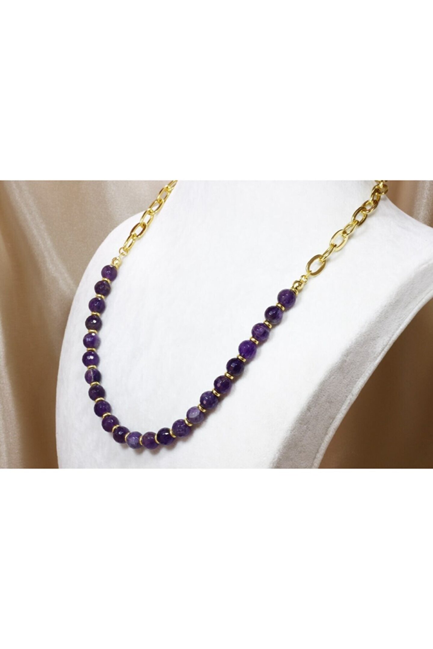 Altın Kaplama Zincirli Tasarım Kolye En tarz zincirlere en şifalı doğal taş yakışırdı. ; 2021 İlkbahar / Yaz modasının en iddaalı modellerinden biri şu an parmaklarınızın ucunda. ; Altın kaplama tarz zincirlerin parıltısı, faset kesimli ametist taşı ışıltısıyla buluştuğunda kendini özel hissetmek isteyen her kadın için muhteşem bir tasarım kolye ortaya çıktı. ; Butik olarak sınırlı sayıda özel tasarlanan Ametist Kolyeye sahip olmak için acele edin. ; Ametist Kolye tane ölçüleri 8 mm / Toplam Uzunluk 51 cm;
