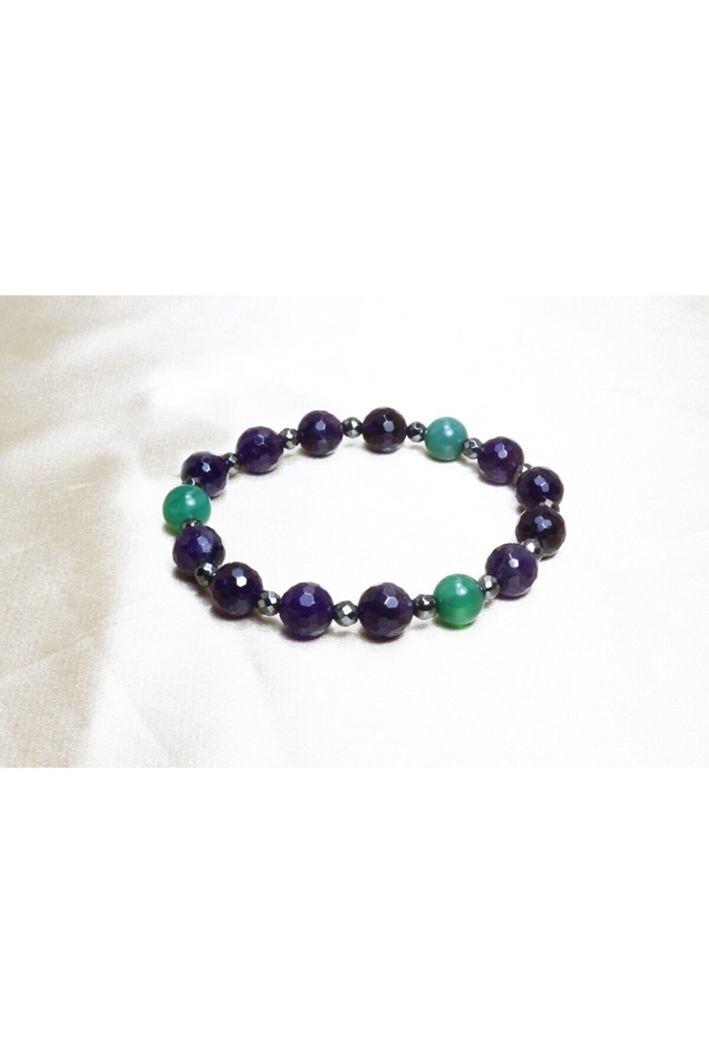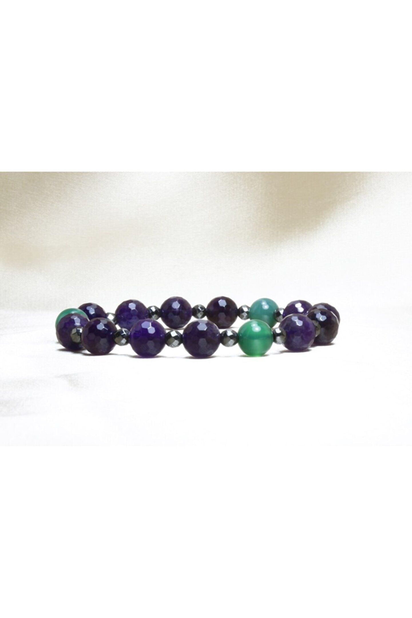 Ametist Taşı, Yeşil Akik güzel uyum oluştururken fasetli ametist ve hematit Bileklik Modelleri arasında zarafeti ve şıklığı ile çok özel bir Doğal Taş Bileklik ortaya çıkardı. ; Akik Taşı özellikleri gibi mor ve yeşilin harika uyumu faset kesimli ışıltılı hematit detaylar ile beğeninize sunuldu. ; Pozitif Enerji veren ve enerji dengenizi sağlayabilecek doğal taşları ile konsantrasyon ve motivasyonunuza katkı sağlayabilir. ; Ilgın Doğal Taş tarafından özenle tasarlanan Doğal Taş Bileklik şık, zarif ve ışıltılı taşlarıyla renk uyumu yanı sıra Doğal Taşlar ve Özellikleri açısından da beklentilerinizi karşılayabilir. ; Bileklik tane ölçüleri 8 mm’dir.;