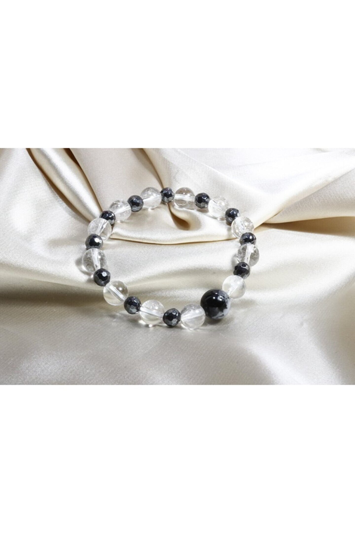 Özel Tasarım Doğal Taşlı Bileklik Butik olarak özel üretilen Kuvars Hematit Bileklik, zıtlıkların birlikteliğinin çok şık bir yorumu olarak karşınızda. ; Kuvars taşının eşsiz şifası ile elmas kesimli hematit taşının parıltısı harika bir uyum içinde size ihtiyacınız olan şıklığı ve sadeliği vaad ediyor. ; Özel tasarım doğal taşlı bileklikte 10 mm küre kesimli rutil kuvars ile detaylandırılmıştır. ; Kuvars bileklik tane ebatları 8 mm / Elmas Kesim Hematit 6 mm;