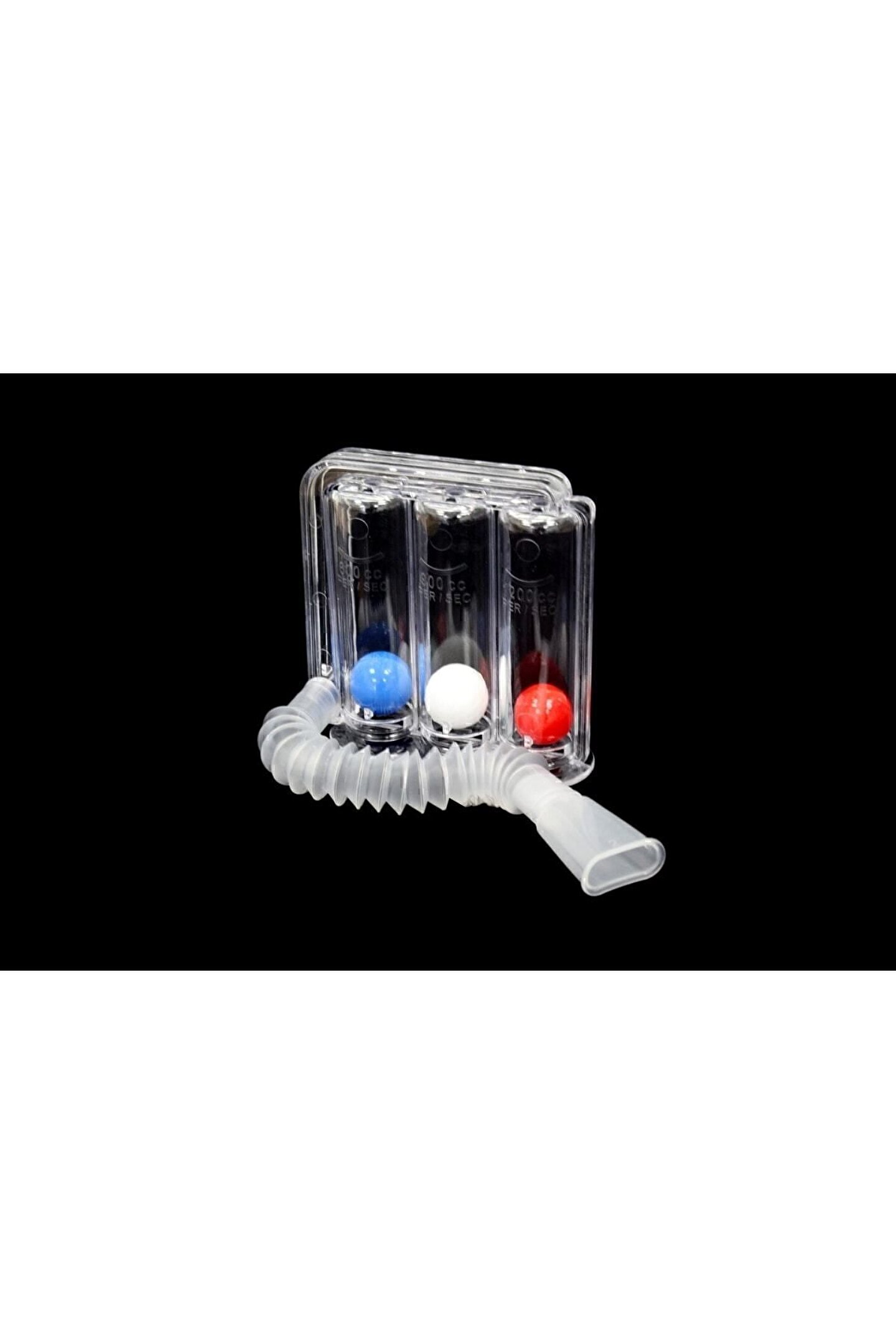 Solunum Egzersiz Cihazı (Triflo) İlmeks 180101Solunum egzersiz cihazları solunum yollarındaki kasları güçlendirmek, daha rahat nefes alıp vermeyi sağlamak, akciğer kapasitesini arttırmak amacıyla kullanılan ürünlerdir; Marka ve modele göre farklılıklar göstermesine rağmen genel olarak cihazların çalışma prensibi benzerdir; Hasta nefes alır, ağızlık yardımıyla nefesini cihaza doğru üfler; Cihaz içinde bulunan toplar, bilyeler ve benzeri maddelerin oluşturduğu direnç sayesinde kişi solunum egzersizi yapar; Plasti; Med 180101 içerisinde mavi, beyaz ve kırmızı olmak üzere 3 adet top bulunan bir solunum egzersiz cihazıdır; Türkiye menşeilidir; Ağızlığın bulunduğu hortum ve topların bulunduğu plastik kısım olmak üzere iki parçadan oluşmaktadır; Hortum topların bulunduğu kısma takılır, nefes ağızlık yardımıyla cihaza doğru üflenir; Plastik kısımda bulunan renkli toplar aynı zamanda nefes seviyesini belirtir; Düşük seviyeli egzersizlerde 600 mililitreye karşılık gelen mavi top nefesle yukarı doğru kaldırılır; Yüksek seviyeli egzersizlerde mavi topla beraber 900 mililitreye karşılık gelen beyaz top da yukarı kaldırılır; Maksimum seviyedeki nefes egzersizleri için ise mavi ve beyaz topla birlikte 1200 mililitreye karşılık gelen kırmızı top yukarı kaldırılır; Tek bir hasta için kullanılmalıdır; Ağırlığı 149 gram, boyu 14,3 santimetredir; ;;