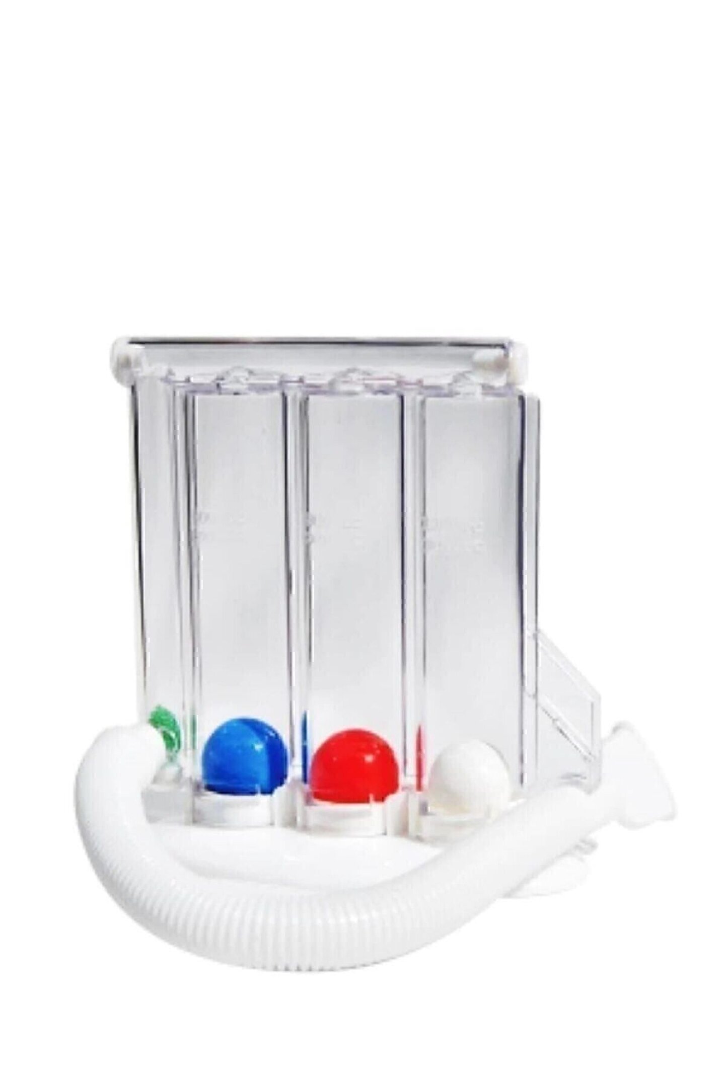 Solunum Egzersiz Cihazı (Triflo) İlmeks 180101Solunum egzersiz cihazları solunum yollarındaki kasları güçlendirmek, daha rahat nefes alıp vermeyi sağlamak, akciğer kapasitesini arttırmak amacıyla kullanılan ürünlerdir; Marka ve modele göre farklılıklar göstermesine rağmen genel olarak cihazların çalışma prensibi benzerdir; Hasta nefes alır, ağızlık yardımıyla nefesini cihaza doğru üfler; Cihaz içinde bulunan toplar, bilyeler ve benzeri maddelerin oluşturduğu direnç sayesinde kişi solunum egzersizi yapar; Plasti; Med 180101 içerisinde mavi, beyaz ve kırmızı olmak üzere 3 adet top bulunan bir solunum egzersiz cihazıdır; Türkiye menşeilidir; Ağızlığın bulunduğu hortum ve topların bulunduğu plastik kısım olmak üzere iki parçadan oluşmaktadır; Hortum topların bulunduğu kısma takılır, nefes ağızlık yardımıyla cihaza doğru üflenir; Plastik kısımda bulunan renkli toplar aynı zamanda nefes seviyesini belirtir; Düşük seviyeli egzersizlerde 600 mililitreye karşılık gelen mavi top nefesle yukarı doğru kaldırılır; Yüksek seviyeli egzersizlerde mavi topla beraber 900 mililitreye karşılık gelen beyaz top da yukarı kaldırılır; Maksimum seviyedeki nefes egzersizleri için ise mavi ve beyaz topla birlikte 1200 mililitreye karşılık gelen kırmızı top yukarı kaldırılır; Tek bir hasta için kullanılmalıdır; Ağırlığı 149 gram, boyu 14,3 santimetredir; ;;