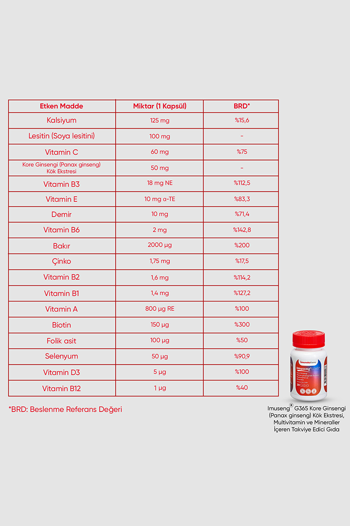 İmuneks Farma İmuseng G365 30 KapsülKore Ginsengi (Panax ginseng) Kök Ekstresi, Multivitamin ve Mineraller içeren takviye edici gıda.11 vitamin ve 5 mineral içeriğine sahiptir ve Kore ginsengi (panax) ile desteklenmiş bir multivitamindir.; Panax ginseng olarak bilinen Kore ginsengi, Asya tıbbında geleneksel olarak yüzyıllardır kullanılmaktadır.; İçeriğinde bulunan C vitamini, biotin, kalsiyum, bakır ve demir normal enerji oluşum metabolizmasına katkıda bulunur.; B12 vitamini, B6 vitamini , A vitamini, C vitamini, D vitamini, demir, selenyum ve çinkobağışıklık sisteminin normal fonksiyonuna katkıda bulunur.; Ürün İçeriği: Günlük Doz (1 Kapsül) Miktar (1 Kapsül) BRD* Kalsiyum 125 mg %15,6 Lesitin (Soya Lesitini) 100 mg - Vitamin C 60 mg %75 Kore Ginsengi (Panax ginseng) Kök Ekstresi 50 mg - Vitamin B3 18 mg NE %112,5 Vitamin E 10 mg ?-TE %83,3 Demir 10 mg %71,4 Vitamin B6 2 mg %142,8 Bakır 2000 µg %200 Çinko 1,75 mg %17,5 Vitamin B2 1,6 mg %114,2 Vitamin B1 1,4 mg %127,2 Vitamin A 800 µg (2667 IU) %100 Biotin 150 µg %300 Folik Asit 100 µg %50 Selenyum 50 µg %90,9 Vitamin D3 5 µg %100 Vitamin B12 1 µg %40 BRD*: Beslenme Referans Değeri Kullanım Şekli:Sadece yetişkinler içindir.; Günde 1 kapsül alınması önerilmektedir.; Tercihen gıdalar ile birlikte, sabah alınması önerilmektedir.; Uyarıcı Bilgiler:Tavsiye edilen günlük porsiyonu aşmayınız.; Takviye edici gıdalar normal beslenmenin yerine geçmez.; Çocukların ulaşamayacağı yerde saklayınız.; Hastalıkların önlenmesi veya tedavi edilmesi amacı ile kullanılamaz.; Hamilelik ve emzirme dönemi ile hastalık veya ilaç kullanılması durumlarında doktorunuza danışınız.