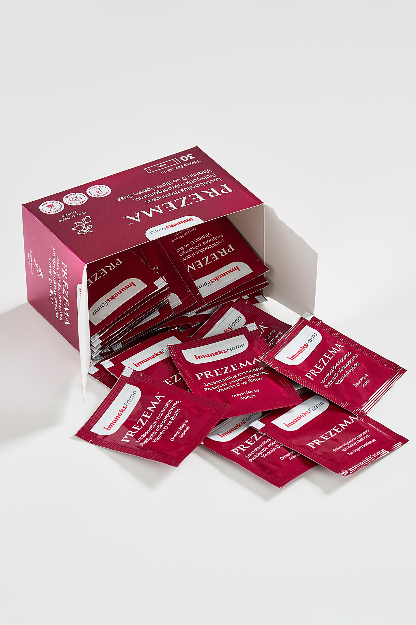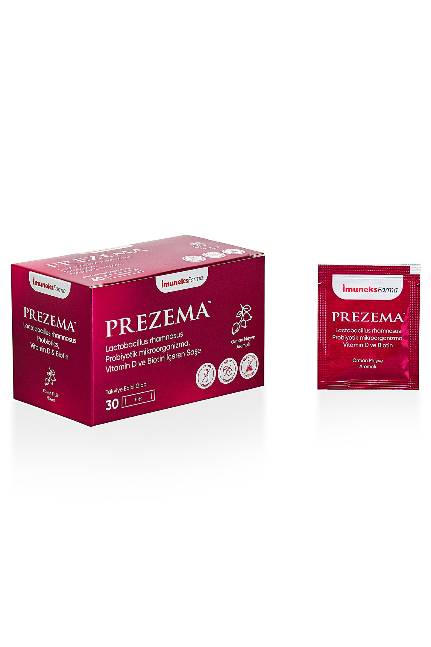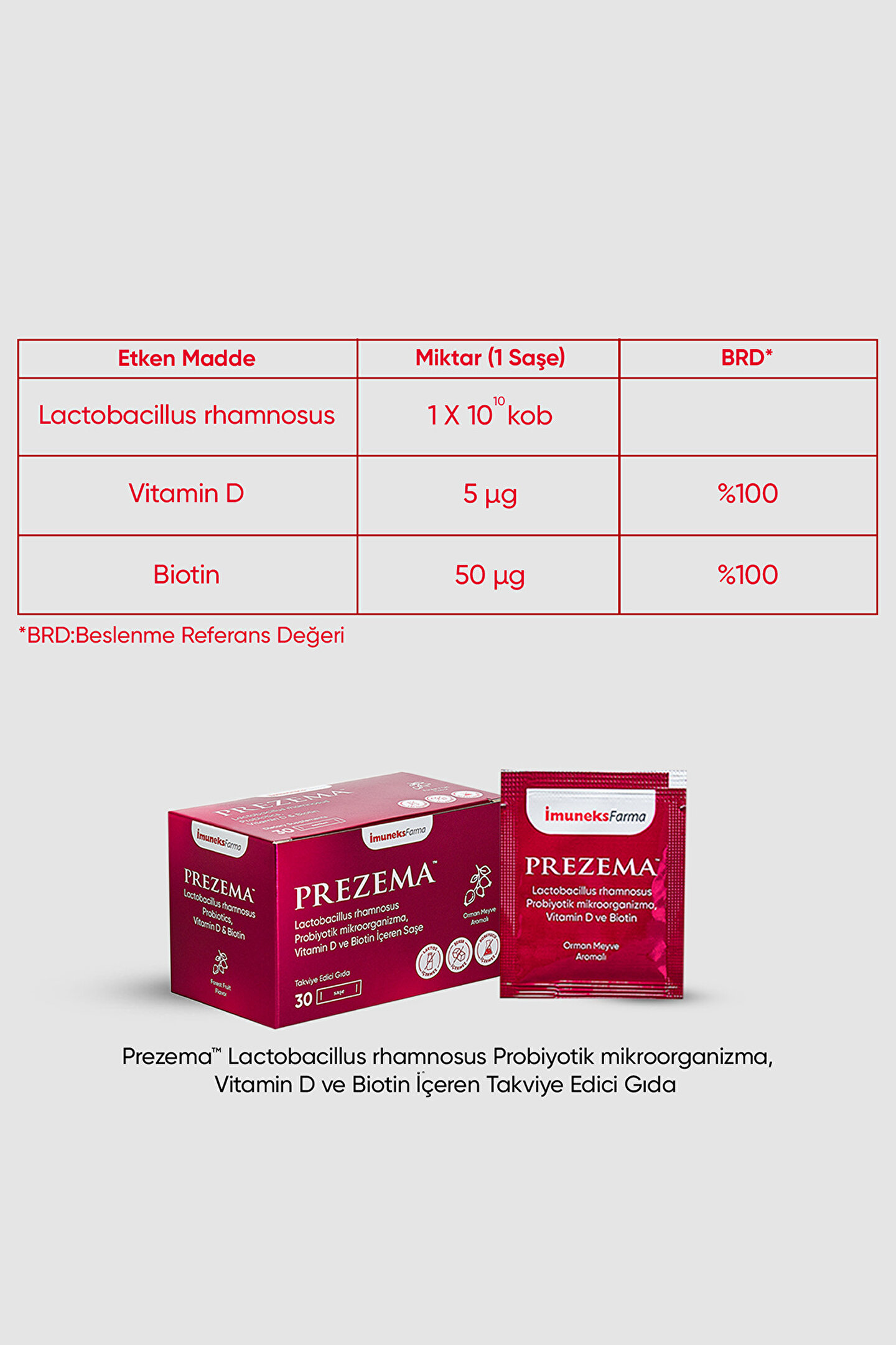 Prezema™ Prezema Lactobacillus rhamnosus Probiyotik mikroorganizma, Vitamin D, ve Biotin İçeren Takviye Edici Gıda 30 SaşeOrman meyve aromalı “Bu ürün probiyotik mikroorganizma içerir.; Probiyotik mikroorganizmalar sindirim sistemini düzenlemeye ve bağışıklık sistemini desteklemeye yardımcı olur.; ”*“Biotin normal cildin ve normal saçın korunmasına katkıda bulunur.; ”* *Türk Gıda Kodeksi Beslenme ve Sağlık Beyanları Yönetmeliği (29960 mükerrer / 26.01.2017 tarihli resmi gazete) Etken Maddeler Miktar(1 saşe) BRD* Lactobacillus rhamnosus 1x10¹? kob Vitamin D 5 µg 100% Biotin 50 µg 100% *BRD: Beslenme Referans Değeri Maltodekstrin, Topaklanmayı önleyici (İzomalt), Lactobacillus rhamnosus (probiyotik mikroorganizma), Orman meyvesi aroma verici, D Vitamini preparatı (Kolekalsiferol), D-Biotin.; Laktoz, şeker, koruyucu içermez.; Kullanım Bilgisi 4-10 yaş grubu çocuklar ve 11 yaş üzeri yetişkinler için günde bir kez, bir saşe ürün bir bardak suda (200 ml’de) çözündürülerek tüketilmesi önerilir.; Uyarılar: Aşırı tüketimi laksatif etki yaratabilir.; Çocukların ulaşamayacağı yerde saklayın.; Tavsiye edilen günlük porsiyonu aşmayın.; Hamilelik ve emzirme dönemi ile hastalık veya ilaç kullanılması durumlarında doktorunuza danışın.; Dengeli ve çeşitli beslenme ile sağlıklı yaşam önemlidir.; Takviye edici gıdalar normal beslenmenin yerine geçemez.; İlaç Değildir.; Hastalıkların önlenmesi veya tedavi edilmesi amacıyla kullanılmaz.25°C’nin altında kuru ve serin yerde muhafaza edilmelidir.