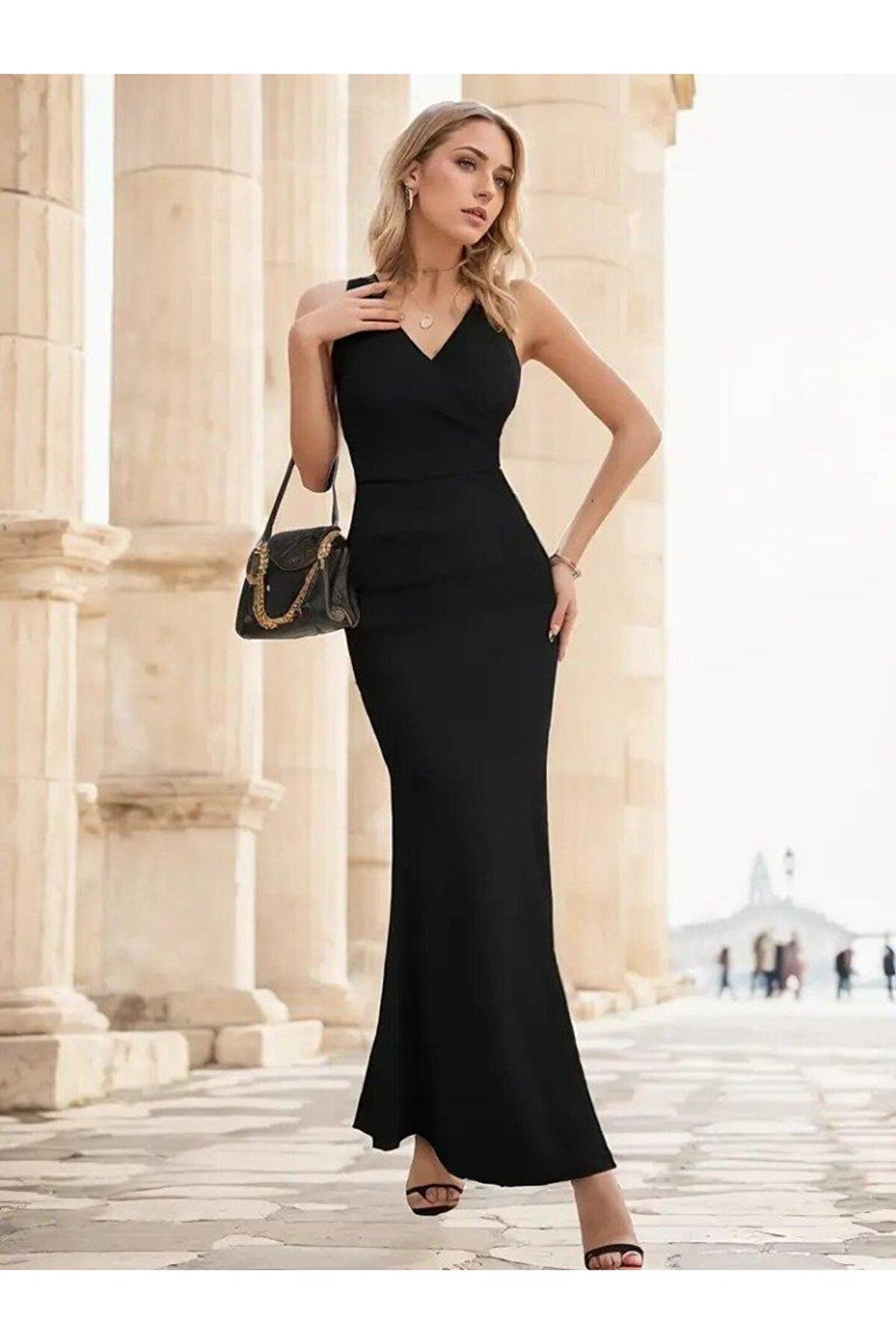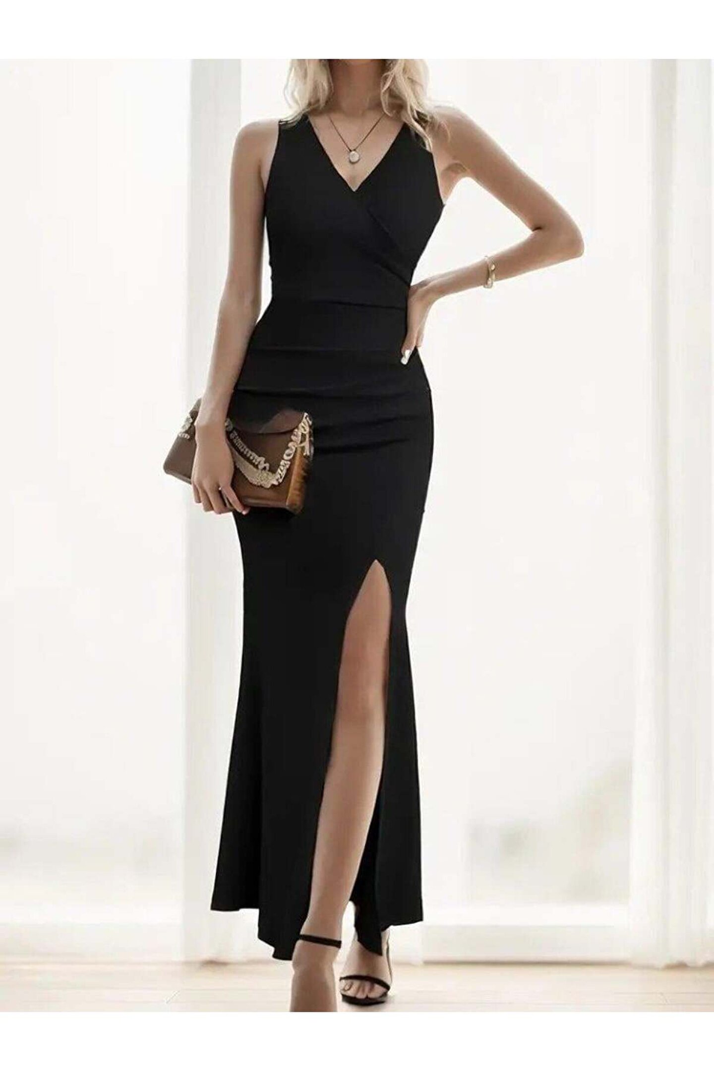 Kadın Askılı Kruvaze Yaka Yırtmaç Detaylı Janjan Krep Elbise