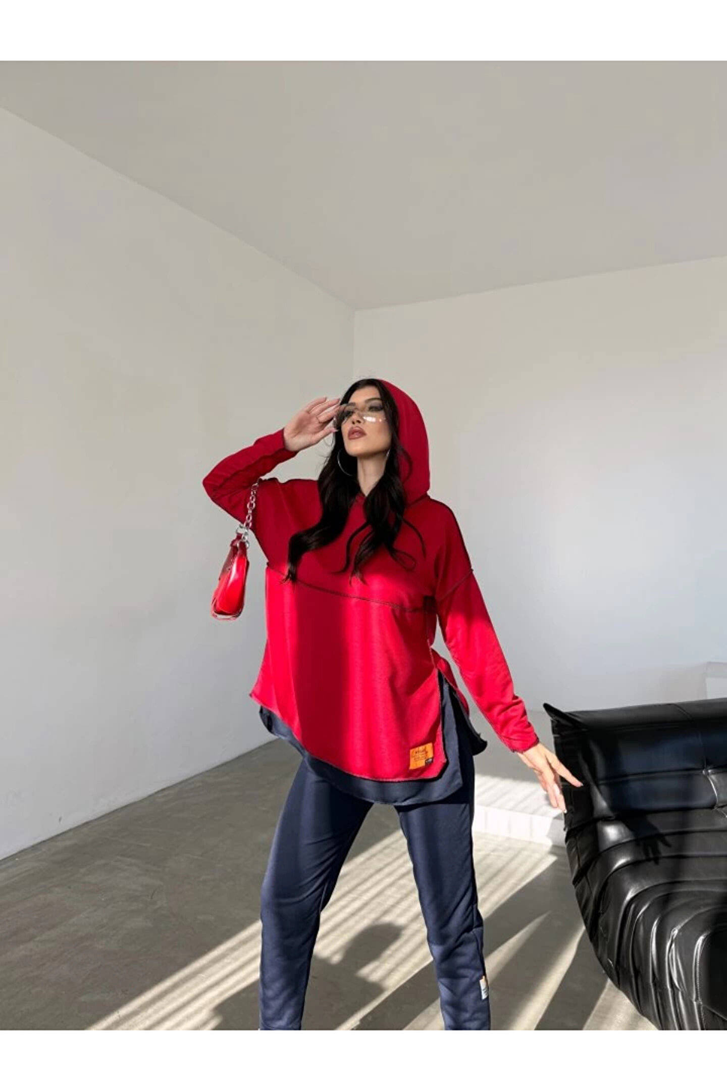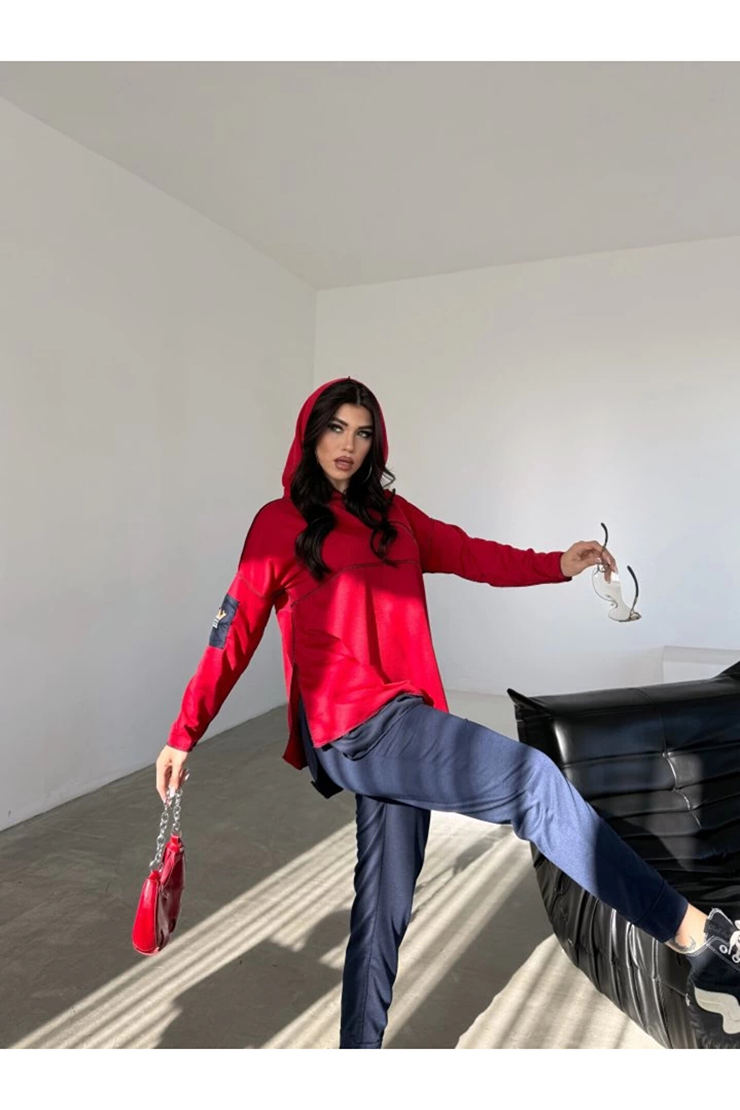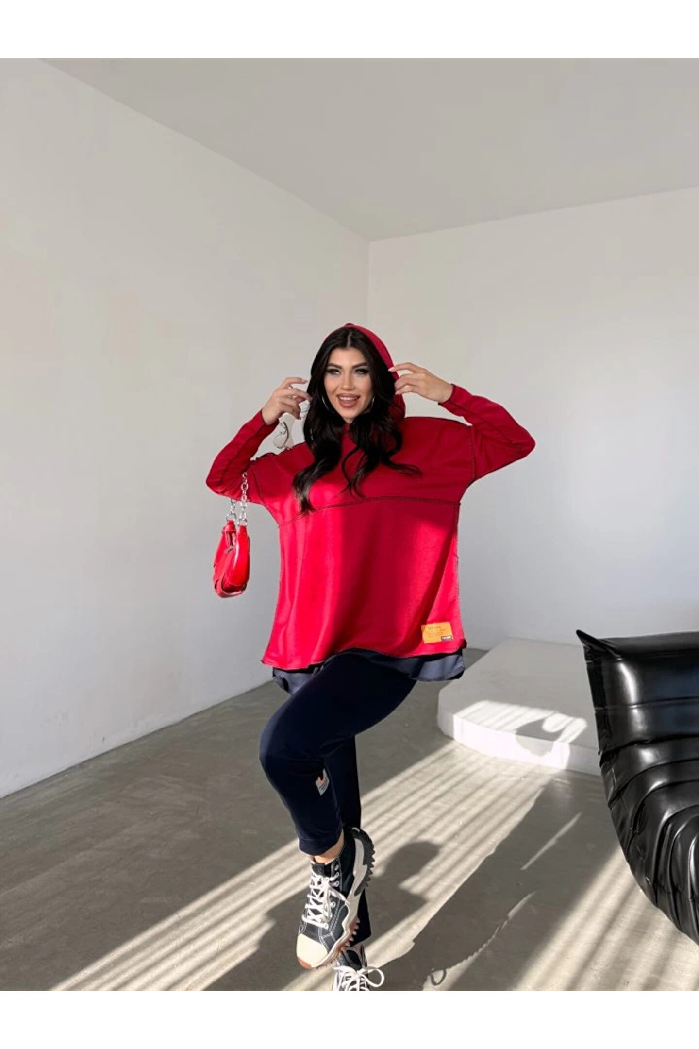 Kadın Kırmızı Kapşonlu Etek Ucu Detay Arma Ters Dikiş Gorunumlu Ikili Takım