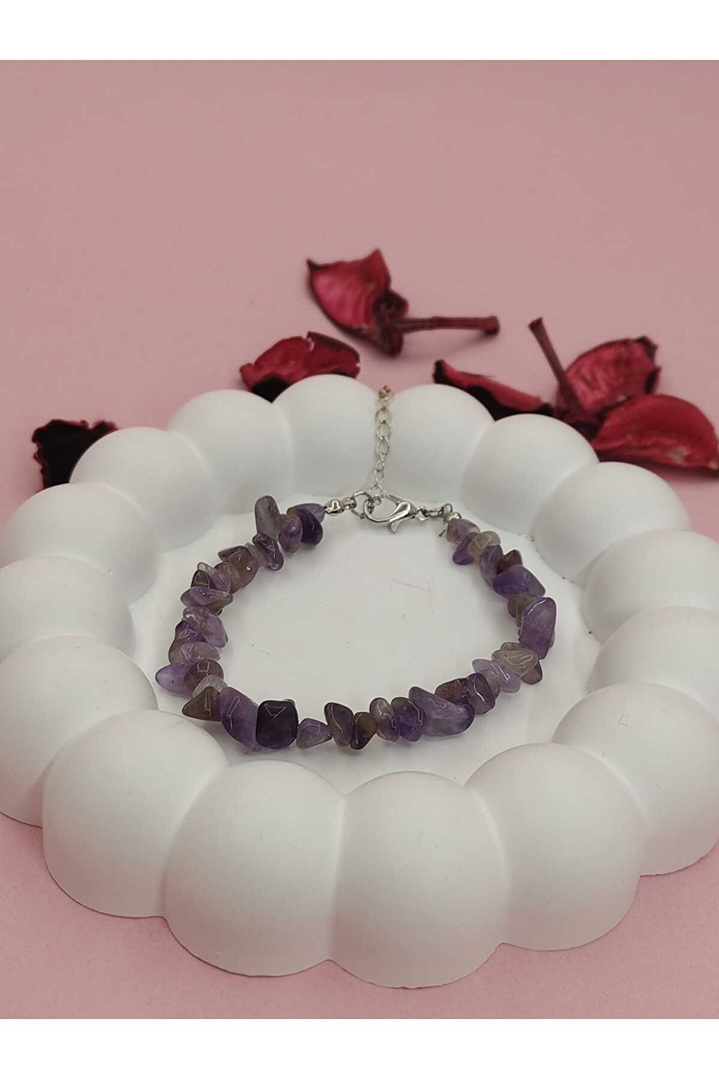 - Ametist kırık taş bileklik, doğal taşların eşsiz güzelliğini yansıtarak şıklığınızı tamamlar.; - Nemli bir bez ile kolayca temizlenebilir; böylece her zaman parlaklığını korur.; - Kadın ve kız kullanıcılar için idealdir; zarif tasarımıyla günlük kombinlerinizde fark yaratır.; - Türkiye'de üretilmiş olup, yerel kaynaklardan temin edilen malzemelerle el işçiliğiyle hazırlanmıştır.; - Metal materyali sayesinde dayanıklılık ve uzun süreli kullanım sunar.; - Doğal taş yapısıyla benzersiz bir dokunuş katarken, her bileklikteki kırık taşların eşsiz deseniyle kişisel tarzınızı ön plana çıkarır.