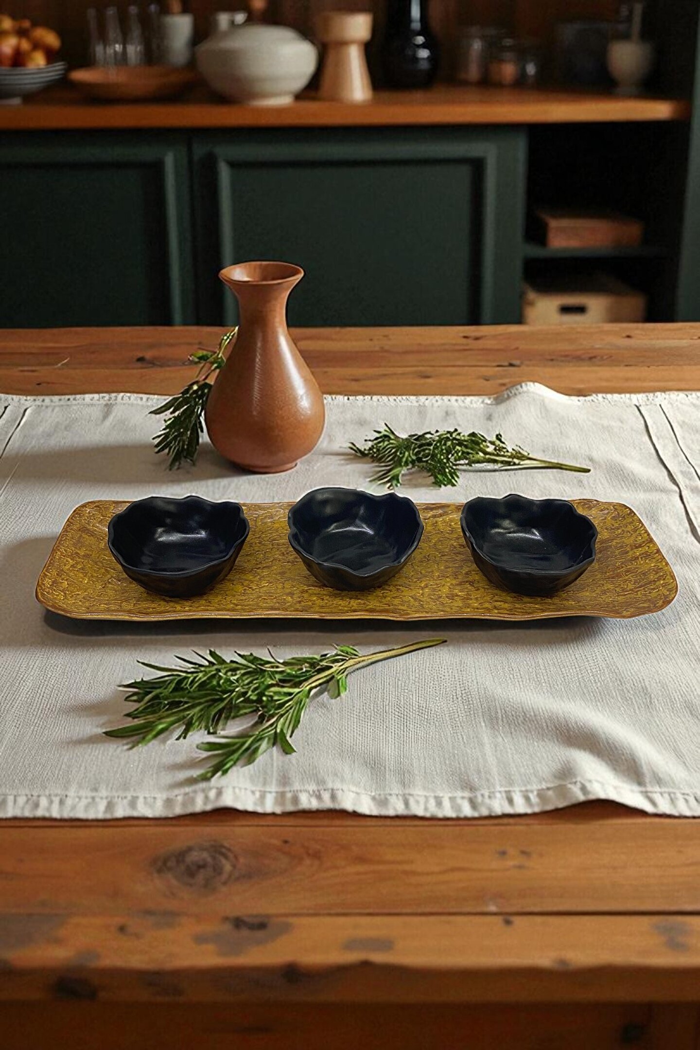 Wood 41 cm Porselen Kayık Sunum Tabağı 1 Adet / Porselen Sosluk Kase 9cm 3 Adet