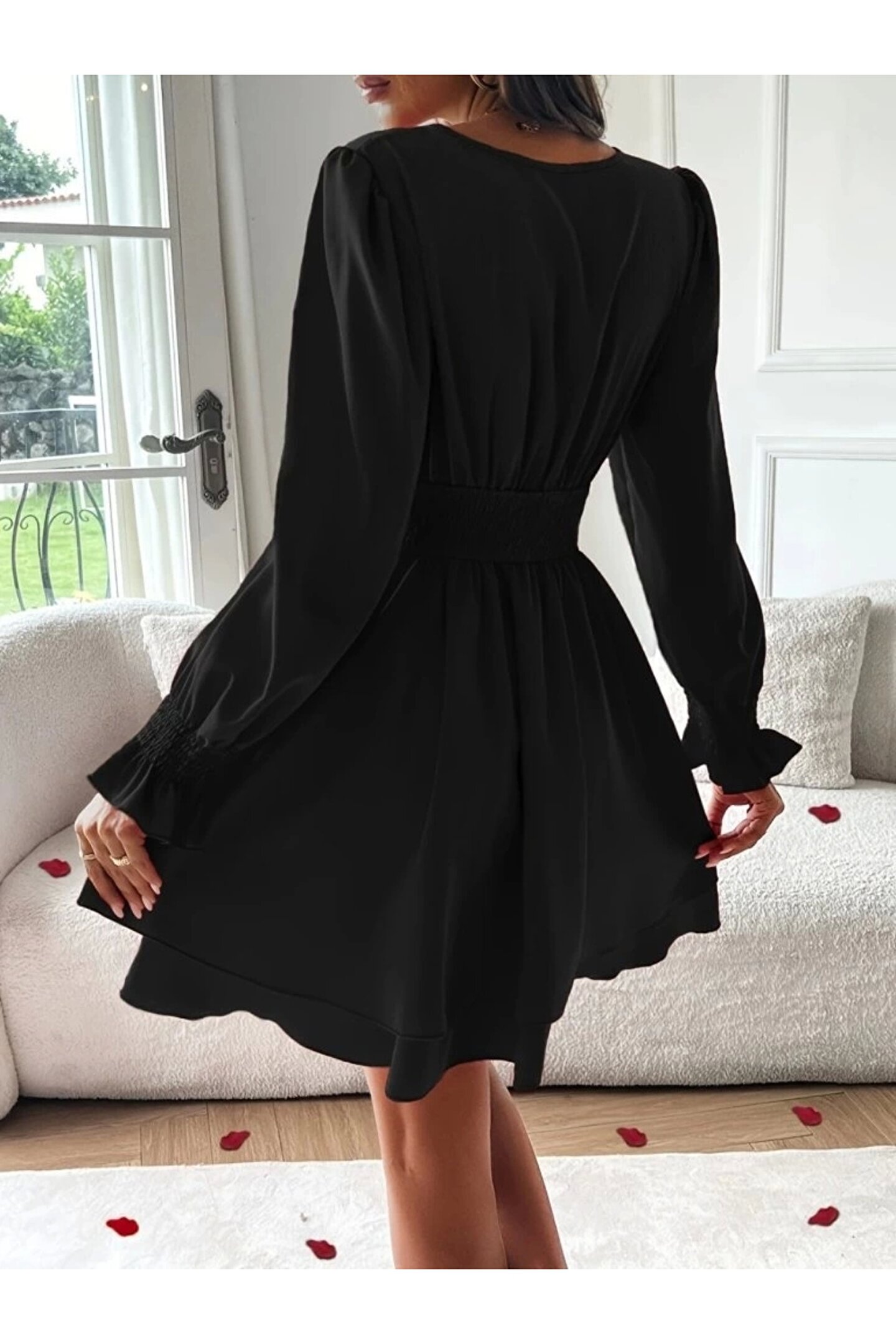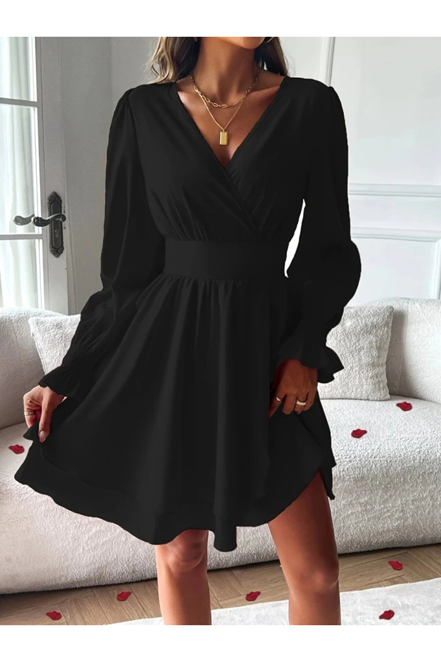 Kadın Uzun Kollu Kruvaze Yakalı Mini Sandy Elbise