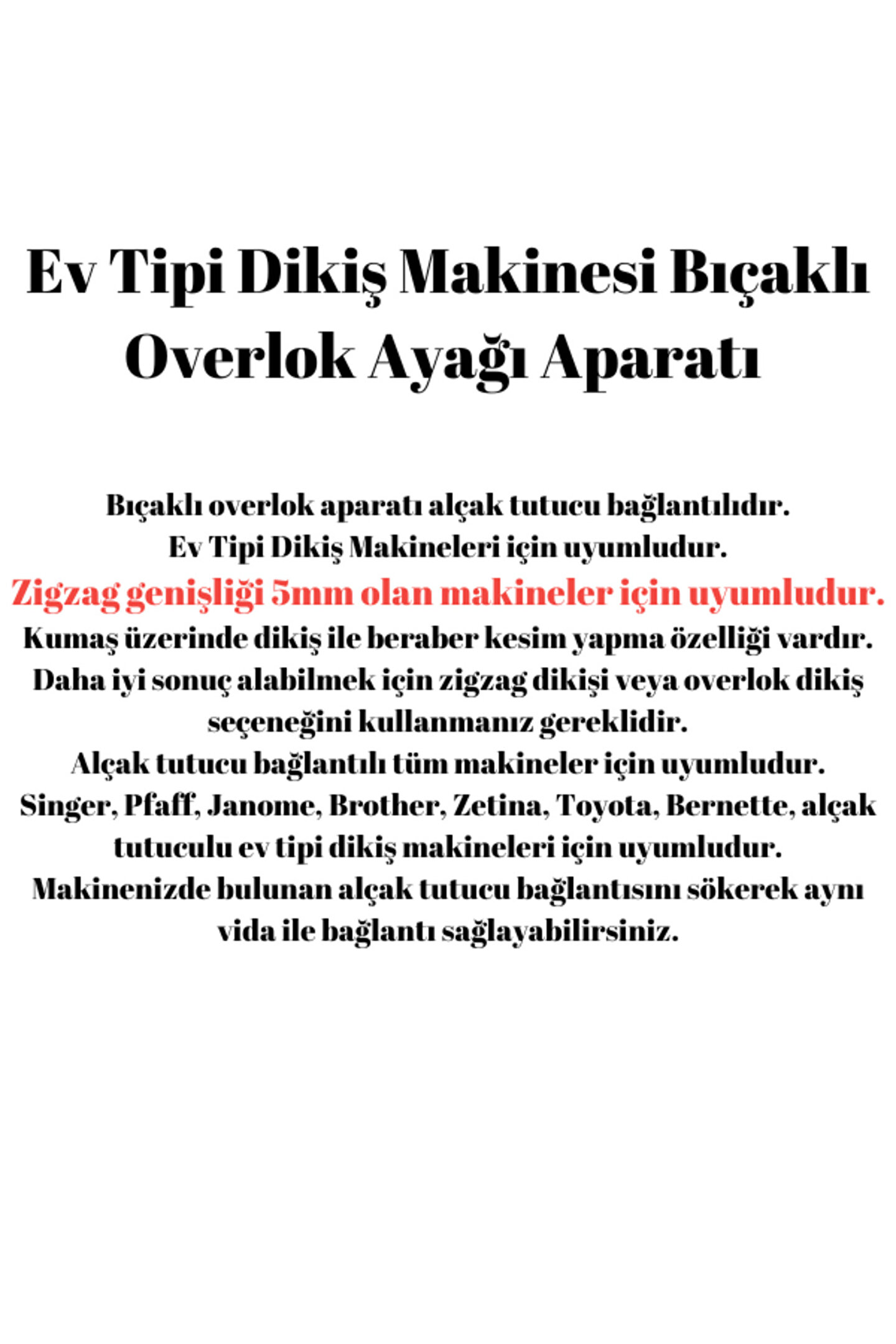 *Bıçaklı Overlok Ayağı *Ön kısımdaki bıçaklar sayesinde kumaşı önden keser, arkadan zigzag yaprak düzgün bir overlok dikişi görüntüsü verir.; Basit kullanımlar için uygundur Bıçaklı overlok aparatı alçak tutucu bağlantılıdır.; ; Zigzag genişliği 5mm olan makineler için uyumludur.; ; Kumaş üzerinde dikiş ile beraber kesim yapma özelliği vardır.; ; Daha iyi sonuç alabilmek için zigzag dikişi veya overlok dikiş seçeneğini kullanmanız gereklidir.; ; Alçak tutucu bağlantılı tüm makineler için uyumludur.; ; Singer, Pfaff, Janome, Brother, Zetina, Toyota, Bernette, alçak tutuculu ev tipi dikiş makineleri için uyumludur.; ; Makinenizde bulunan alçak tutucu bağlantısını sökerek aynı vida ile bağlantı sağlayabilirsiniz.; ; Bıçaklı Overlok Ayağı: Ev Tipi Dikiş Makinası Overlok Ayakları ? Overlok Bıçaklı Ayak Fiyatları R-CT 10L Yedek Parça, Overlok Yedek Parça, Ev Tipi Overlok Yedek ParçaOVERLOK AYAK TAKILIŞI 423S overlok ayağını takmak için, ilk önce makina üzerindeki ayarlar resimde görülen konuma getirilir.; ; (zigzag genişliği 4-5 olabilir) Daha sonra üzerinde takılı olan ayaklar çıkarılıp, resimde görülen duruma getirilir.; ; Takılacak overlok ayağı Overlok ayağının üst tarafa gelen çatal kısmı makinanın üzerindeki yatay konumda duran çubuğa takılır(Kırmızı çizgi ile gösterildiği gibi), ayağın yan sıkıştırma bacakları ise dikey konudaki ayak takılan çubuğun dış tarafına resimde görüldüğü gibi takılır ve vidası sıkıştırılır.; ; Overlok ayağını taktıktan sonra resimdeki gibi bir görüntü oluşacaktır.; ; Overlok ayağını taktık sıra test etmeye geldi, DiKKAT : Eğer üst resimdeki görüldüğü gibi takılmamış ise makinanızın zarar görmemesi için kesinlikle çalıştırmayın, işlem adımlarını kontrol ederek tekrar baştan yenileyin Resimde görüldüğü gibi kumaşın 2 cm kesildikten sonra yerleştirilmesi, makinanın kumaşı çekmesinde kolaylık sağlayacaktır.; ; Daha sonra resimde görüldüğü gibi, kumaş yerleştirilir.; ; Dikiş yapılır.; ; Ve sonuç NOT: Overlok ayağının çalışabilmesi için iğne üstündeki çengel çıkartılmalı yada aşağı doğru eğilmelidir.; ; Ürün Kodu: R-CT10L;