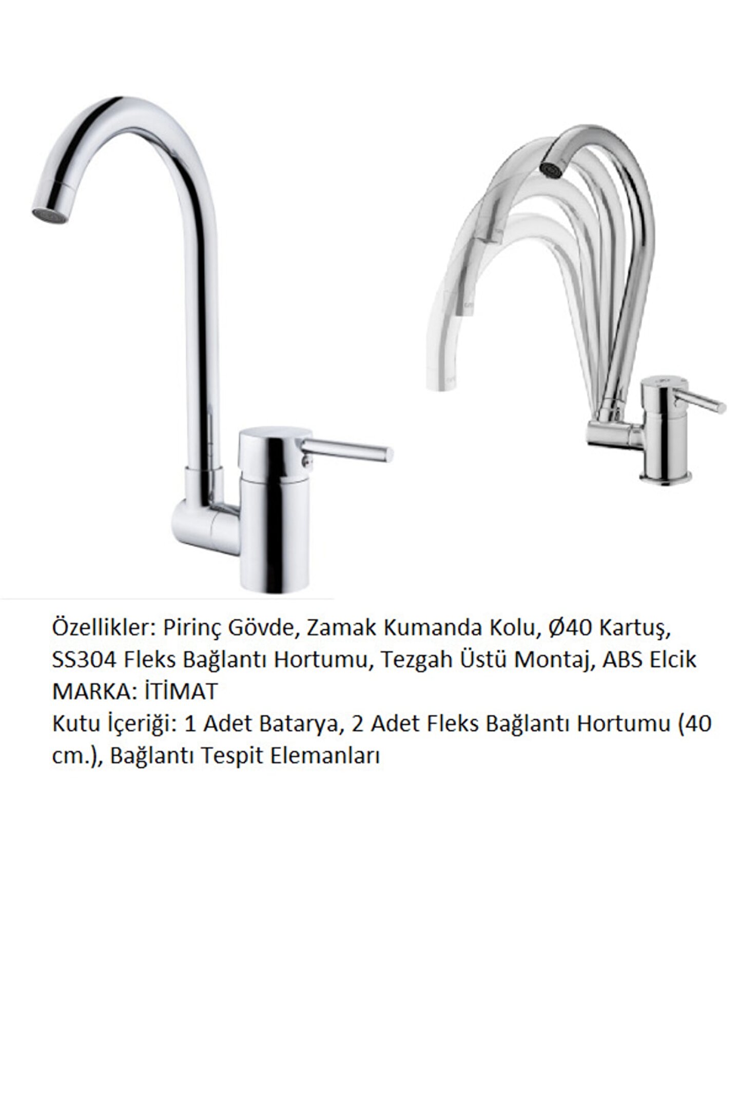 ÖZELLİKLER Kutu İçeriği: 1 Adet Batarya, 2 Adet Fleks Bağlantı Hortumu (40 cm.), Bağlantı Tespit Elemanları Pirinç Gövde, Zamak Kumanda Kolu, Ø40 Kartuş, SS304 Fleks Bağlantı Hortumu, Tezgah Üstü Montaj, ABS Elcik