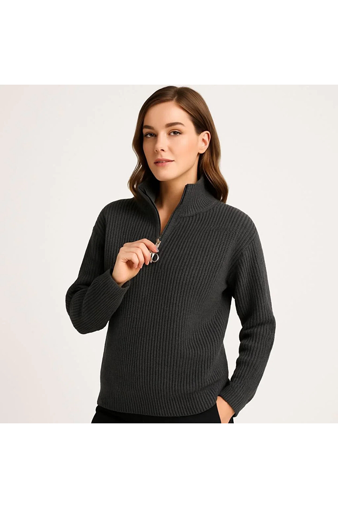 IVORA WEAR KADIN Yarım Fermuarlı Triko Kazak – Selanik Örgü, Dik Yaka, Pamuklu Dokuma, Oversize Uzun Kollu Kışl