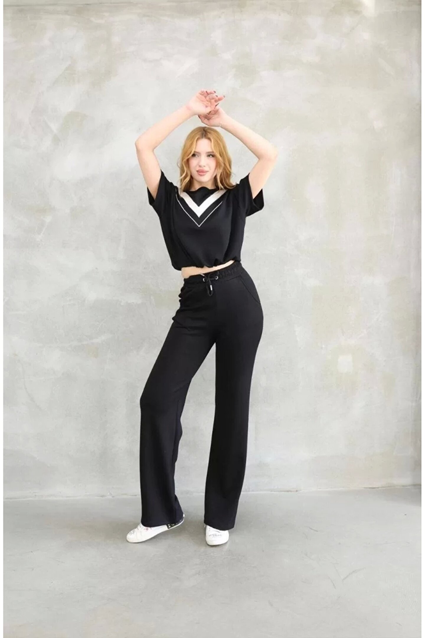 IVORA WEAR Osy Modal Yumuşak dokulu Kumaş Bisiklet Yaka Parçalı detaylı Kısa Kollu Takım - Siyah