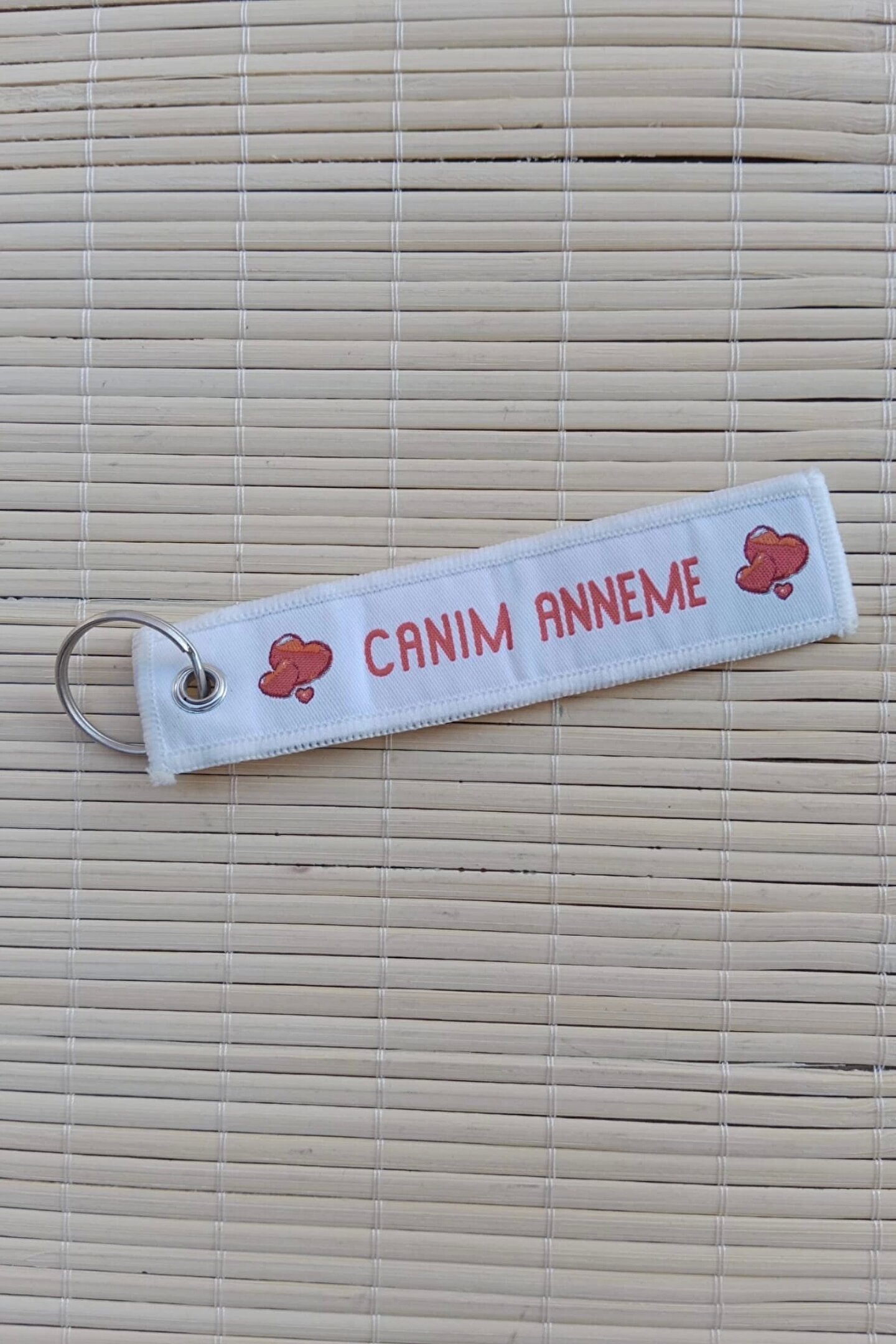 canim anneme yazili beyaz kirmizi nakis islemeli bez anahtarlik