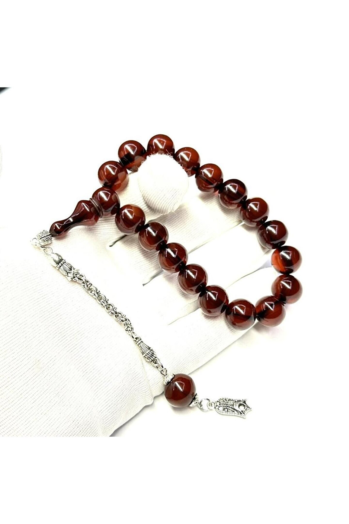 4 Parmak Genişliğinde Maskot Küre Model 13-12mm Püsküllü Sıkma Kehribar Tesbih