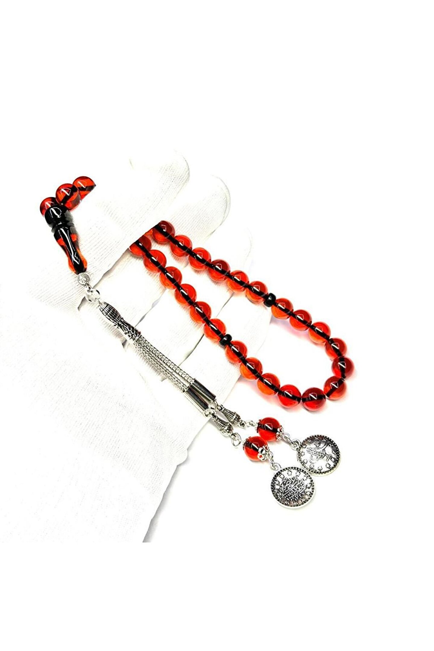 Küre Model Püsküllü 8,5-8,5mm İp Yolları Siyah Renk Kırmızı Sıkma Ateş Kehribar Tesbih