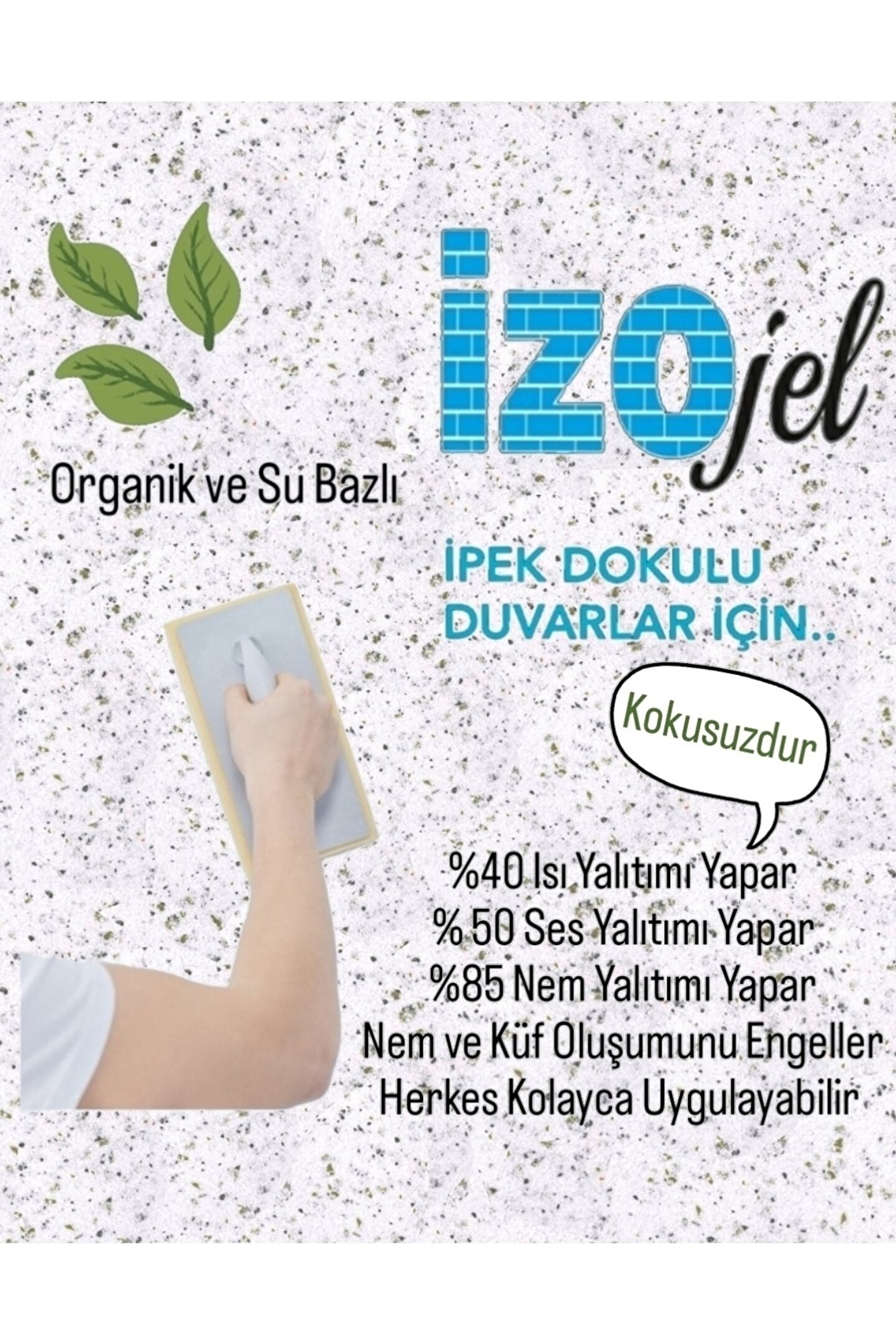 İZOJEL İPEK SIVA DEKORATİF DUVAR SIVASI ÖZELLİKLERİ ; %100 ORGANİK ve DOĞALDIR, DEKORATİFTİR; DUVARDAKİ KUSUR VE ÇATLAKLARI YOK EDER. - %40 ISI YALITIMI - % 50 SES YALITIMI - %85 NEM YALITIMI SAĞLAR. - HER TÜRLÜ YÜZEYE UYGULANABİLİR. - RENK SEÇENEĞİ ÇOK FAZLADIR. - UYGULANMASI KOLAY VE HIZLIDIR. TAMİR EDİLEBİLİR. - KOKUSUZDUR. RENGİ ZAMANLA DEĞİŞMEZ. - ALEV ALMAZ. YANGINA KARŞI DAYANIKLIDIR. - DARBELERE KARŞI DAYANIKLIDIR. - DUVARIN NEFES ALMASINI ENGELLEMEZ. - BÖCEK BARINDIRMAZ. - ANTİSTATİKTİR. ORGANİK YAPIDAKİ İZOJEL DEKORATİF YALITIM İPEK SIVASI Her türlü yüzeye uygulanabilir: Seramik , Beton, Cam, Sıva, Tuğla, Ahşap, Gaz Beton, Boyalı Yüzeyler. YÜZEYDEKİ BOŞLUKLARI DOLDURUR, ÇATLAMAZ. Silinebilir ve tamir edilebilir özelliktedir. Kendinden yapışkanlıdır. Örtücülüğü yüksektir. Yeni Teknoloji Organik Dekoratif Yalıtım Sıvası Doğa dostudur. İnsan sağlığına kesinlikle zararı yoktur. Uygulanacak yüzeylere önceden herhangi bir işlem yapılması gerekmez. Eski boyaların sökülmesi, yüzeylerin kazınması, macun veya sıva çekilmesi gerekmez. Uygulanacak yüzeyin sadece KURU olması yeterlidir. Uygulama esnasında ekstra bir malzemeye gerek yoktur. Her sıcaklıkta uygulama yapılabilir. Sarfiyat: Yüzeye tek kat uygulama yapılması yeterlidir. Ürünün yüzeye uygulama kalınlığı 1,6 mm ile 2 mm arasında olmalıdır. Depolama: Oda sıcaklığı depolama için uygundur. Özel bir ortamda depolama gerektirmez. İZOJEL İPEK SIVA DEKORATİF DUVAR SIVASI NASIL HAZIRLANIR? BİR KABIN İÇERİSİNE 5 LT SU KONULUR. 1 PAKET ÜRÜN SUYUN İÇERİSİNE BOŞALTILIR. YAKLAŞIK 10 DK KARIŞTIRILIR. DAHA SONRA 30 DK KADAR DİNLENDİRİLİP DUVARA PLASTİK MALA İLE UYGULANIR. UYGULAMA ESNASINDA MALAYI 5 DERECE AÇI İLE TUTMANIZ İŞİNİZİ KOLAYLAŞTIRACAKTIR. 1 PAKET İPEK SIVA İLE YAKLAŞIK 4 M2 ALAN KAPLANABİLİR. YÜZEYE UYGULANAN ÜRÜN 12 İLE 24 SAAT ARASINDA KURUR.