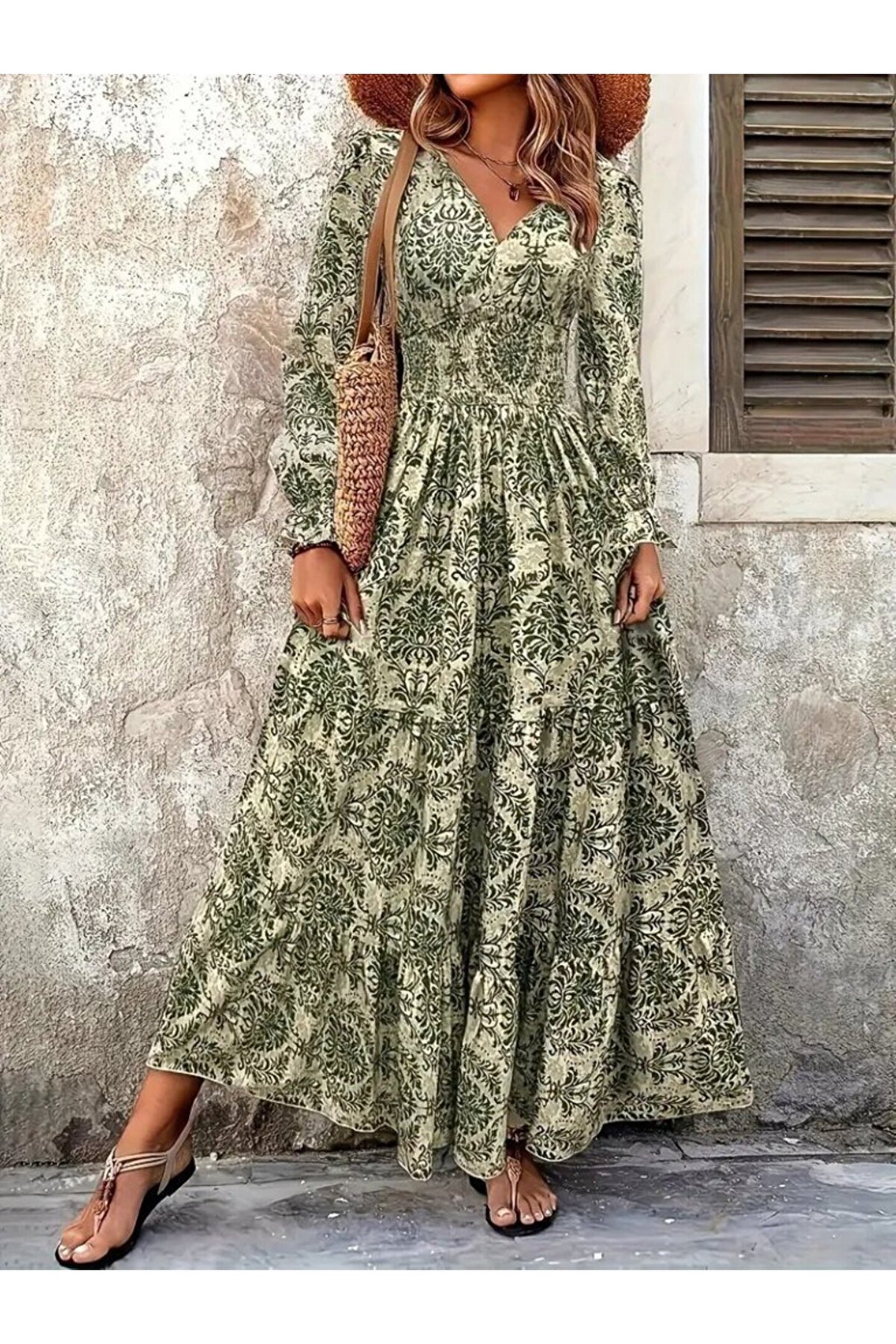 Kadın Uzun Kollu V Yakalı Desenli Süprem Elbise