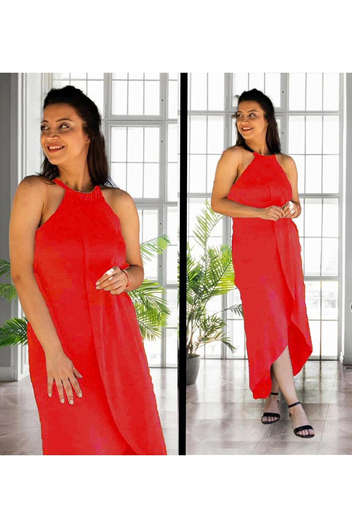 Boyun Askılı Eteği Kruvaze Kesim Viskon Kumaş Elbise