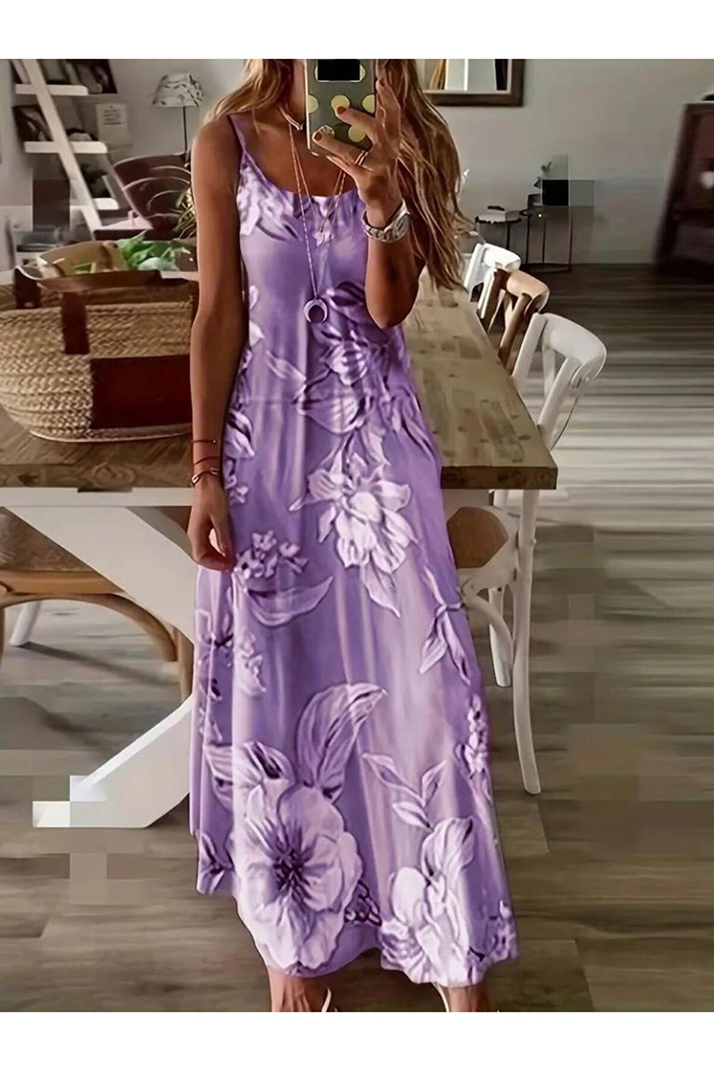 Kadın Askılı Yuvarlak Yaka Etek Geniş Kesim Desenli Süprem Elbise