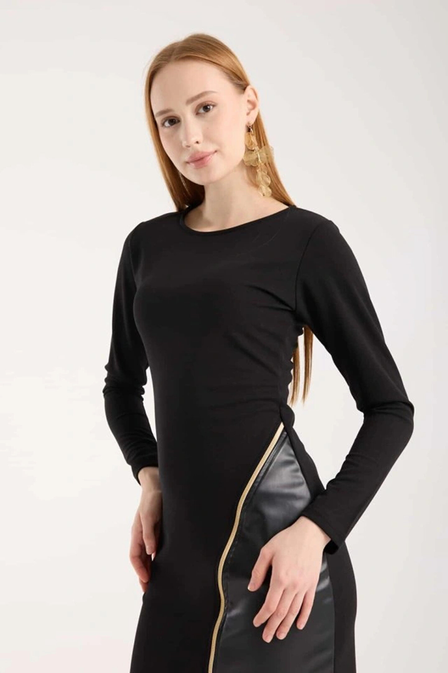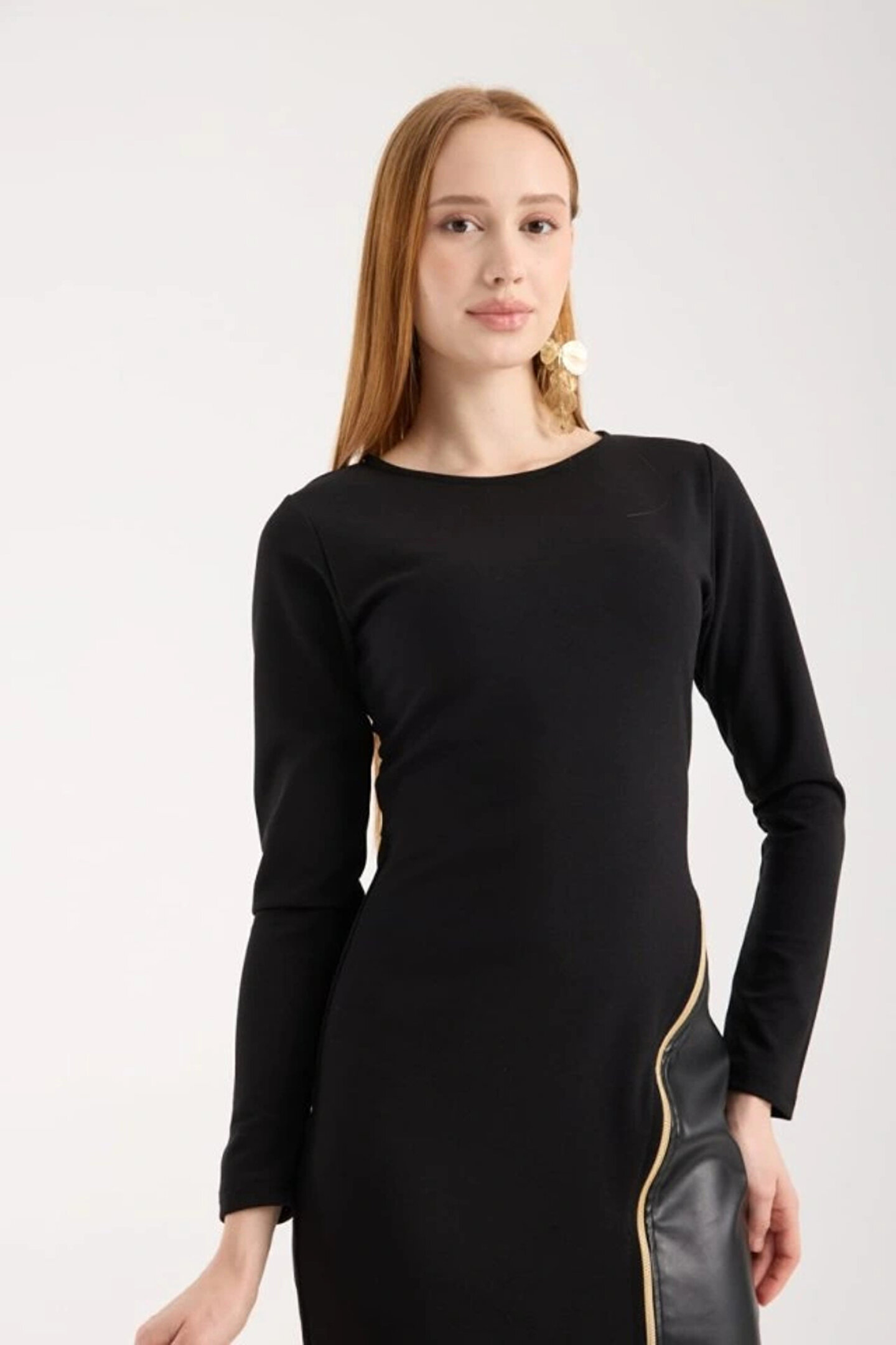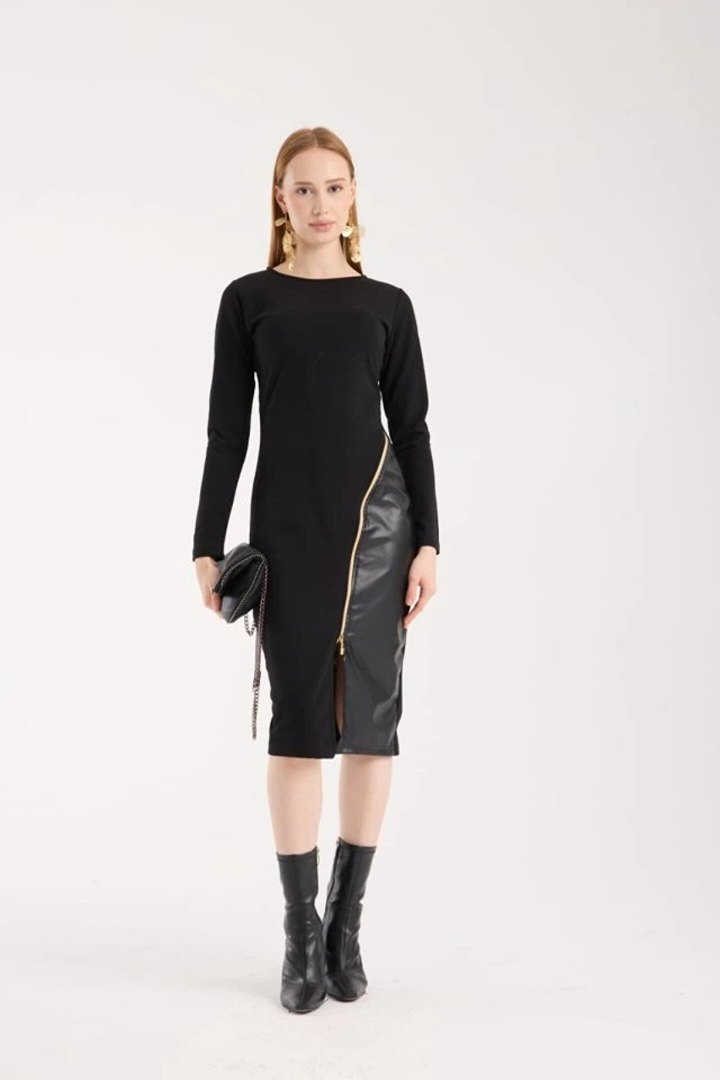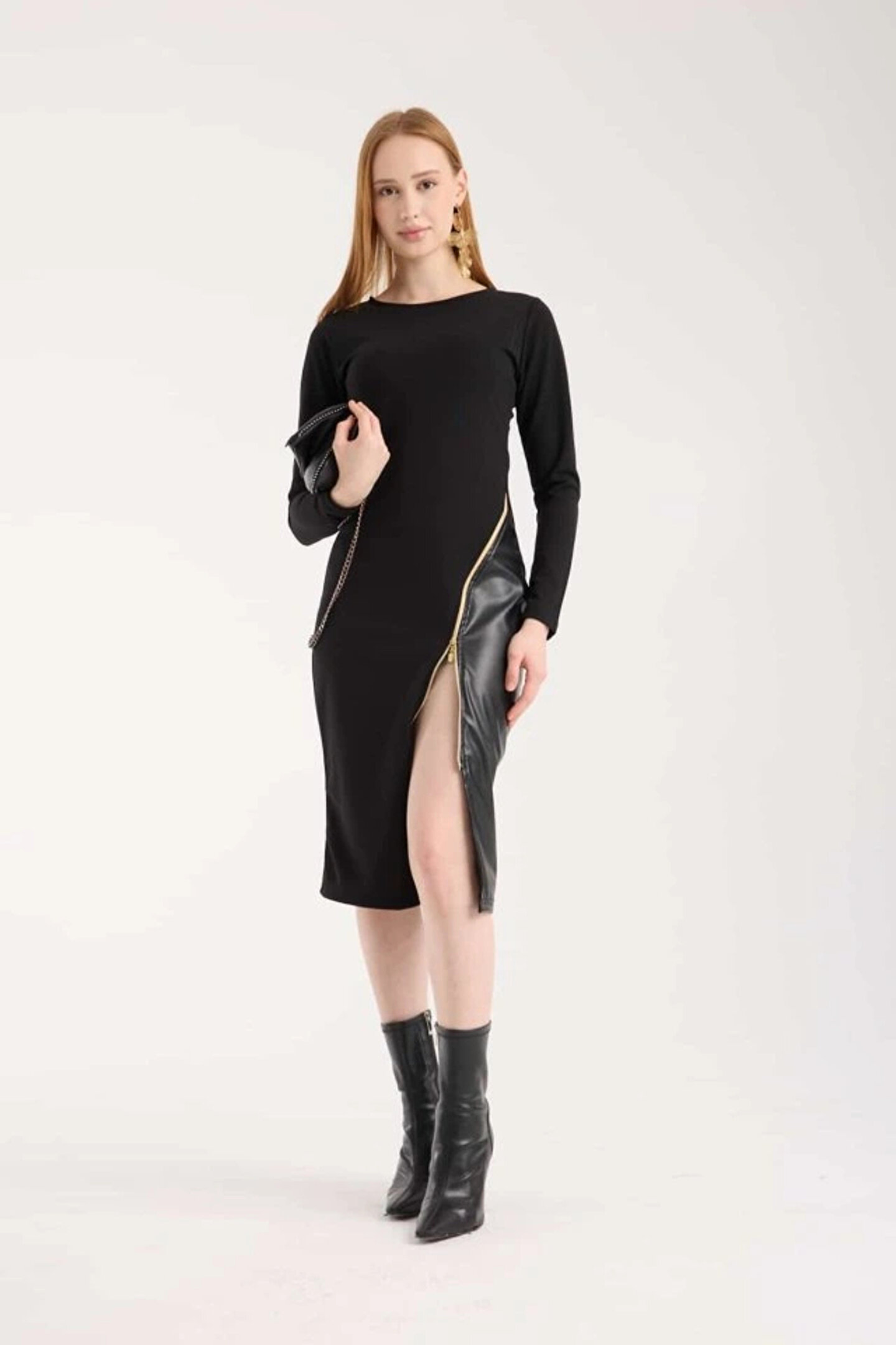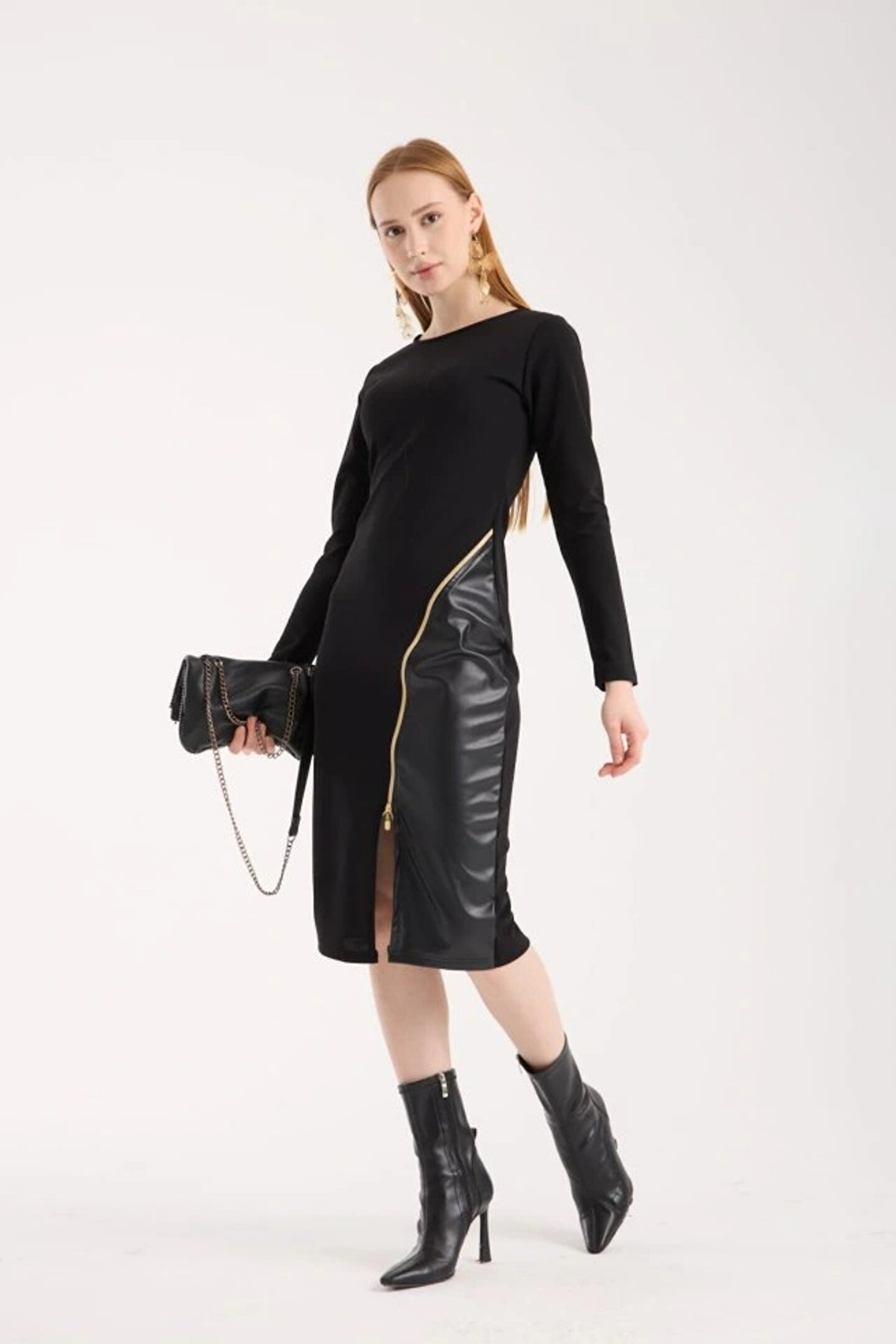 JARDİN ALLURE Kadın Bisiklet Yaka Uzun Kollu Deri Ve Fermuar Detay Mini Yırtmaçlı Elbise